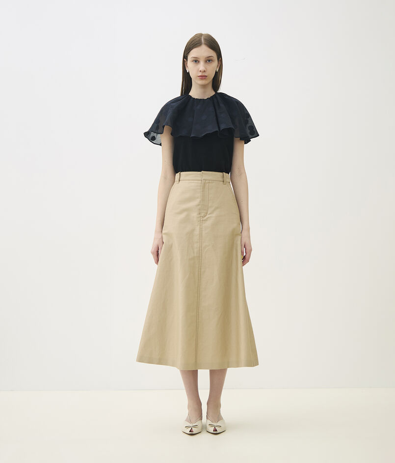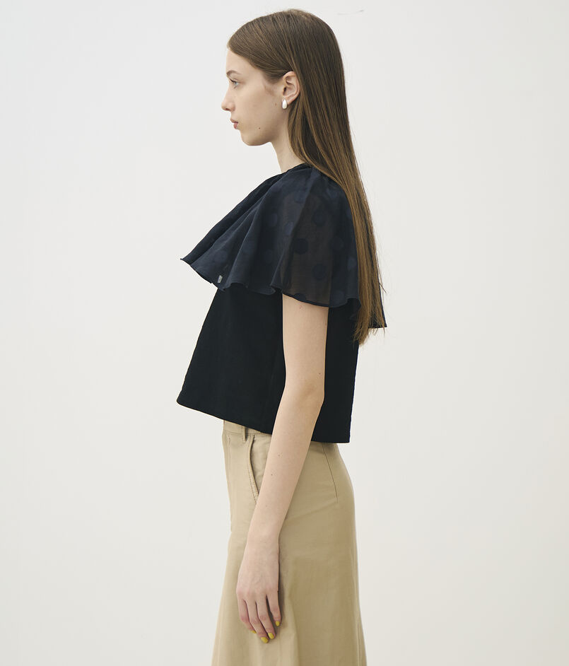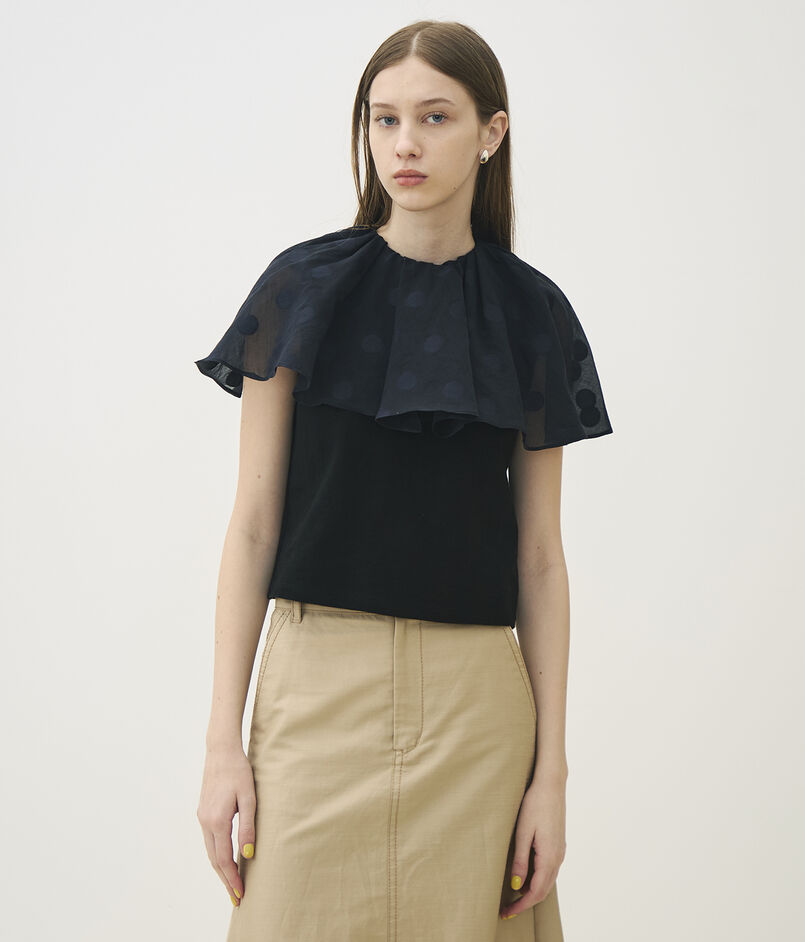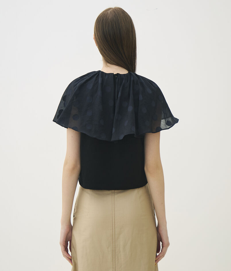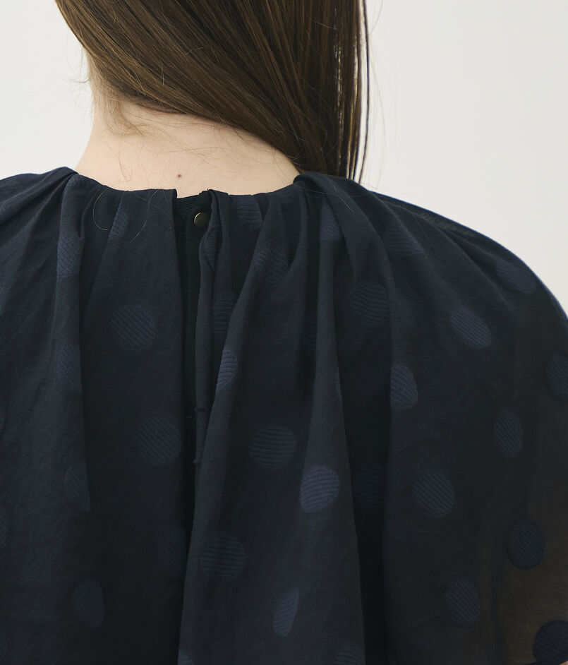 表面に凹凸感のあるジャージー素材と、ドット柄を織り込んだ〈TOMORROWLAND collection〉オリジナルのコットンシルク生地を使用したトップス。