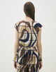 大胆な幾何学模様のプリントの上に、タッターソール柄のハシゴレースの穴あき刺繍を施しています。