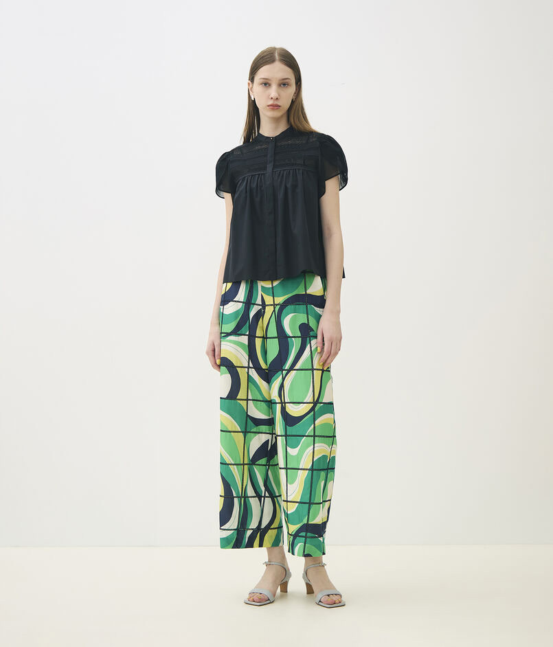 大胆な幾何学模様のプリントの上に、タッターソール柄のハシゴレースの穴あき刺繍を施しています。