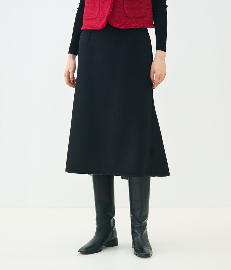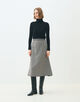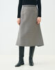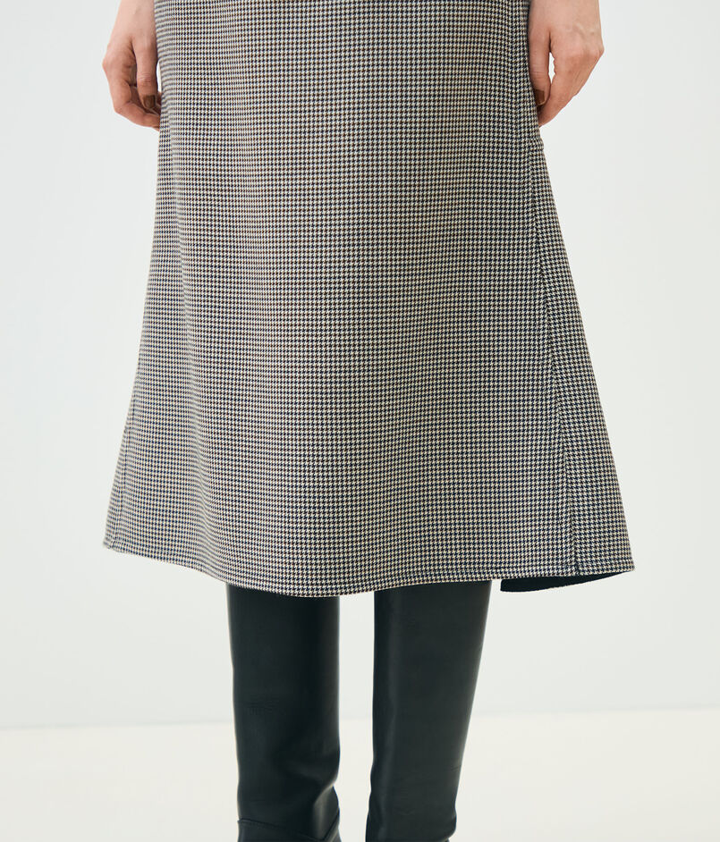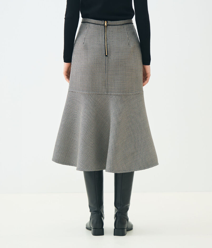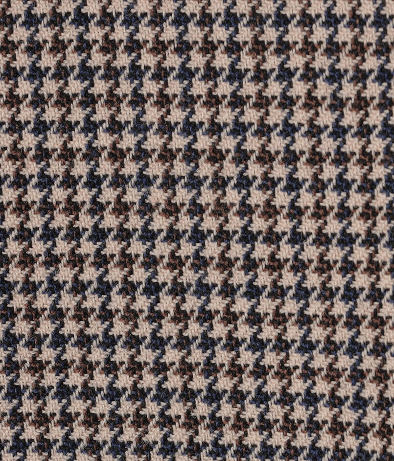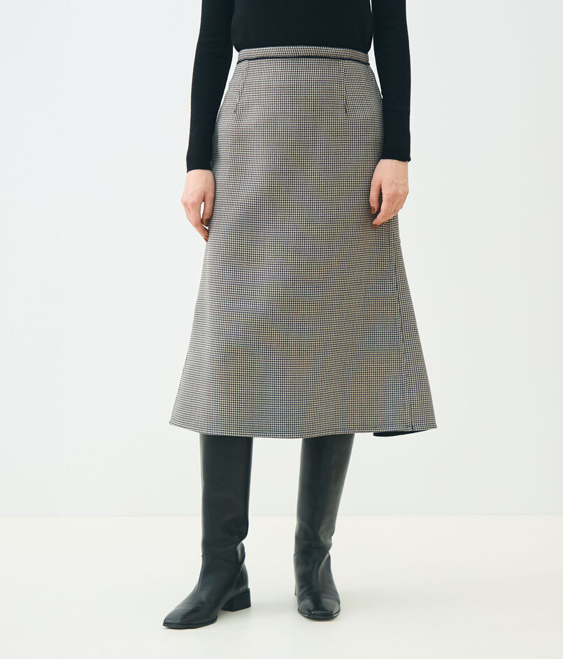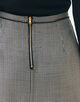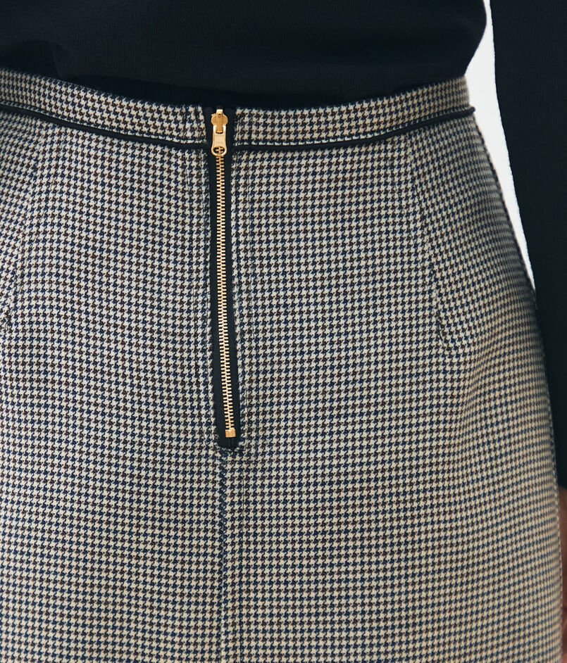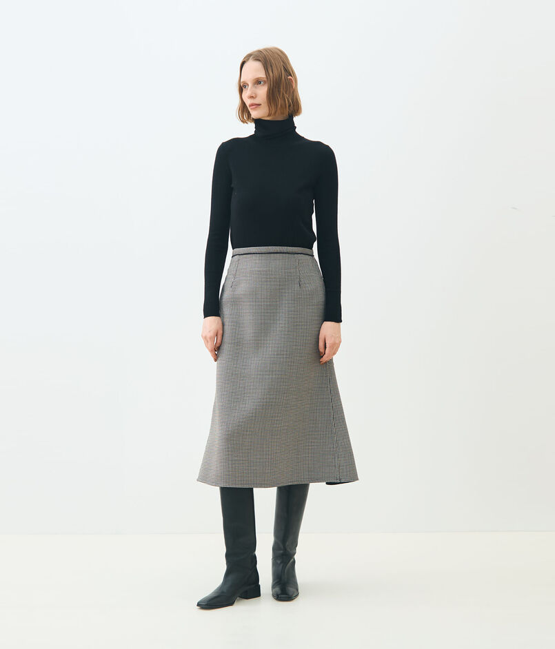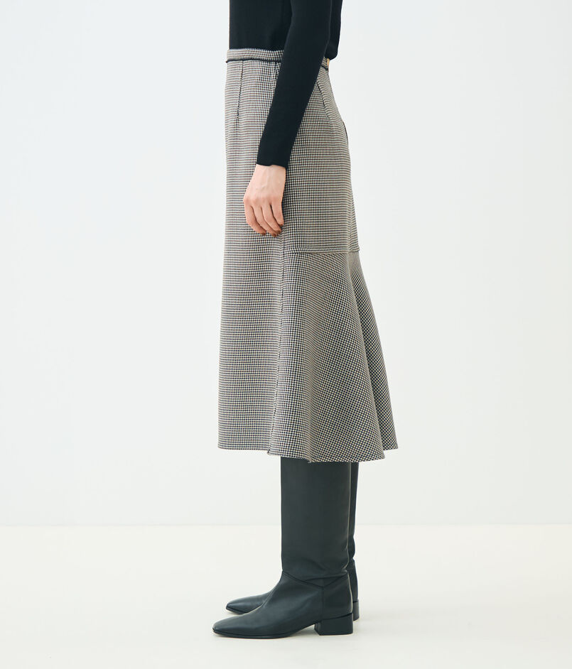 クラシカルなガンクラブチェック柄をベージュ系のカラーをベースにダークブラウン×ネイビーのカラー使いで表現した〈TOMORROWLAND collection〉のオリジナル素材を使用したスカート。