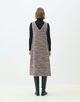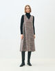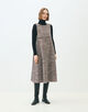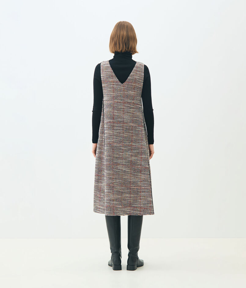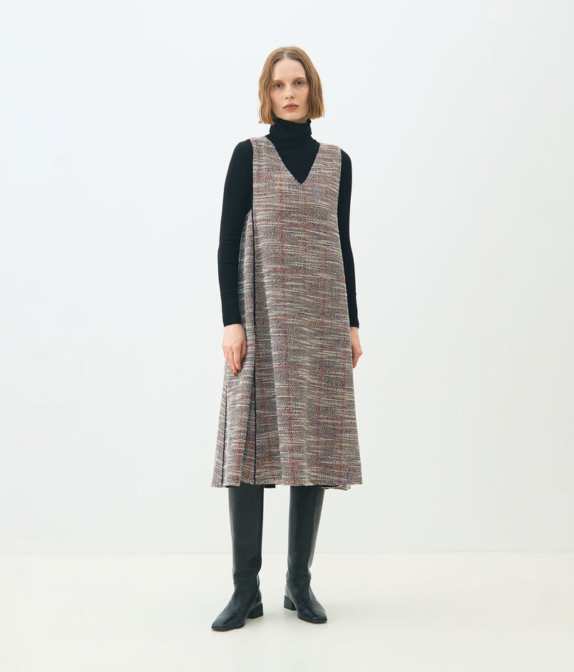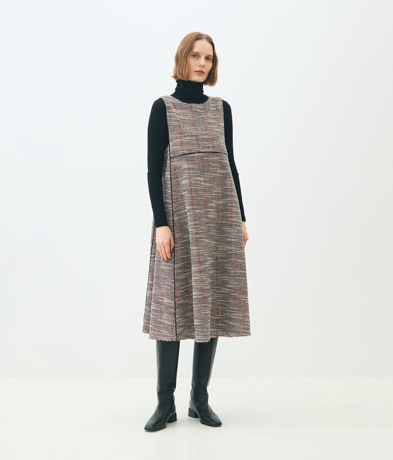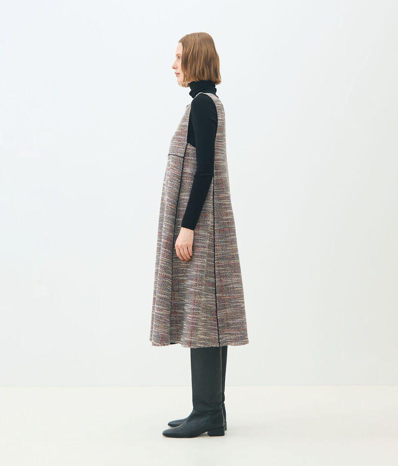 裾に向かって広がるAラインシルエットと膝が隠れる着丈でクラシカルな印象のジャンパースカート。