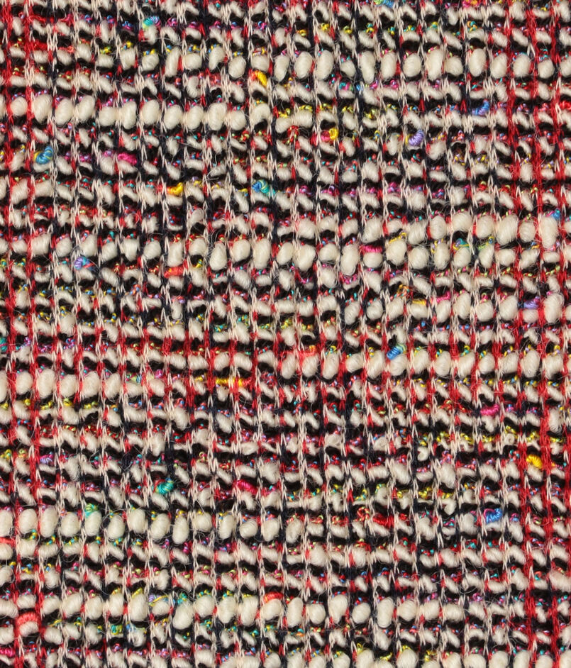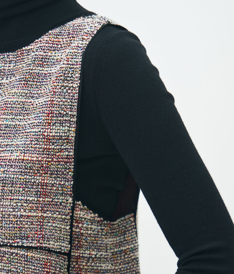 リングヤーンなどのテクスチャーと収縮のある糸とミックスカラーのニット糸を編むことで、凹凸のある表面感と温かみのあるタッチを生み出しています。