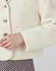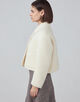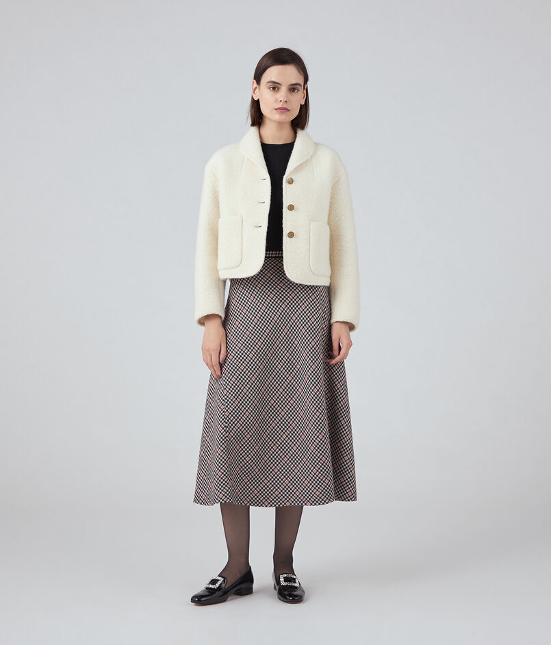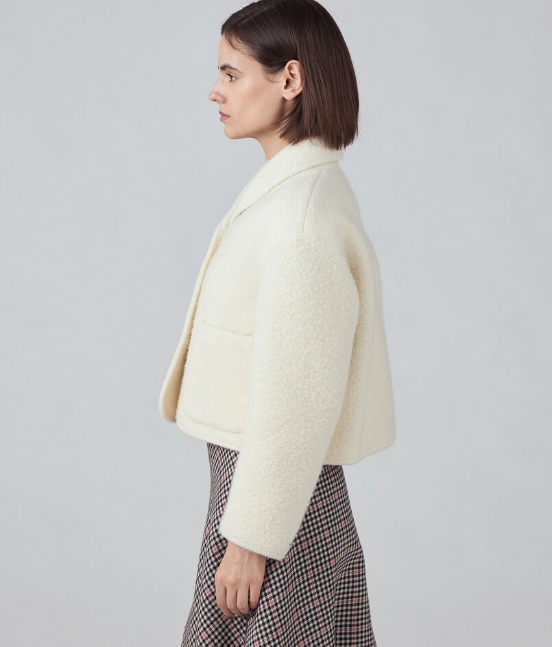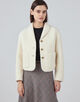 ジャケットはコンパクトなフォルムとショール風の襟でミニマルな印象の一着。