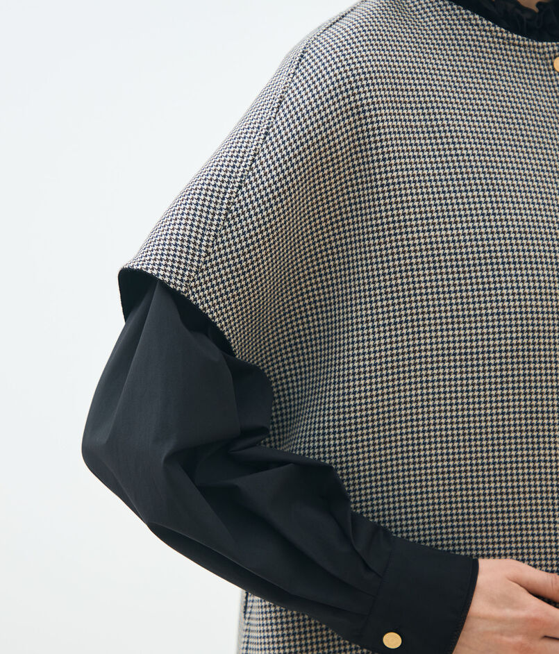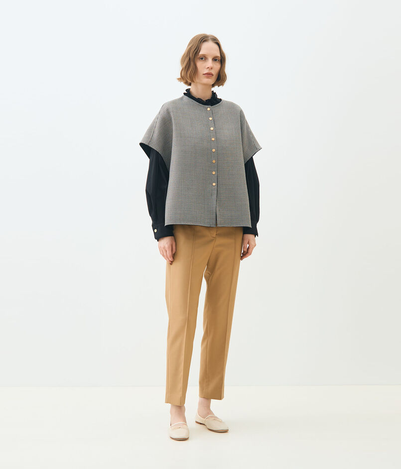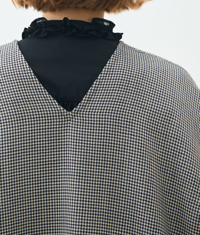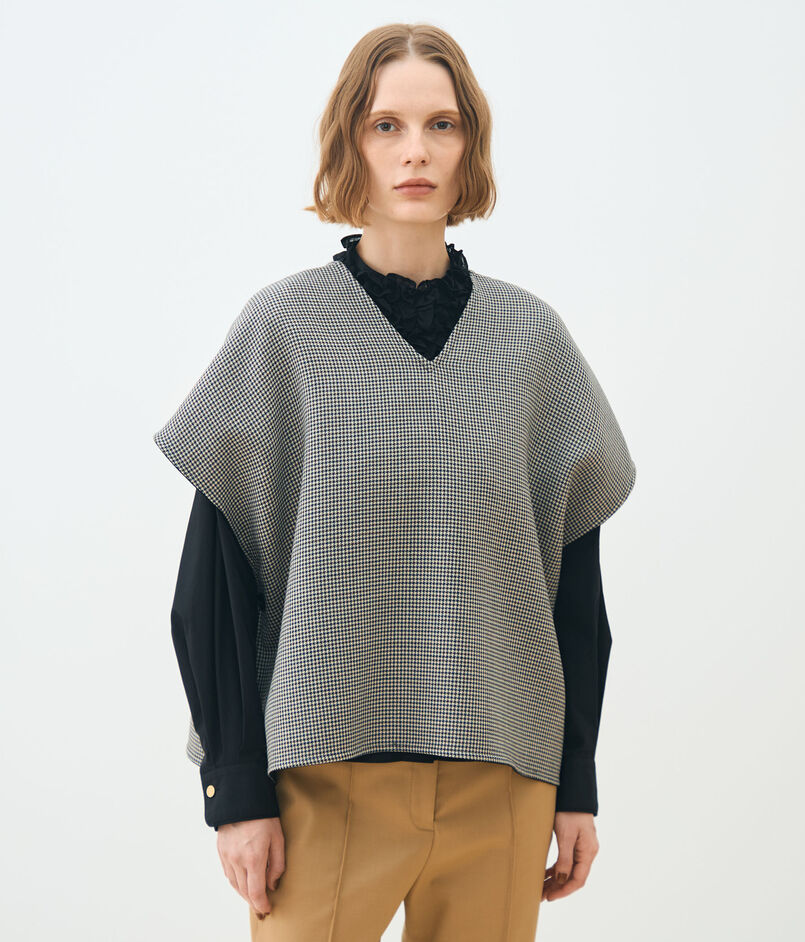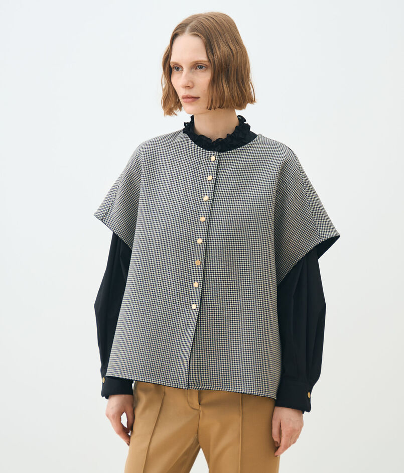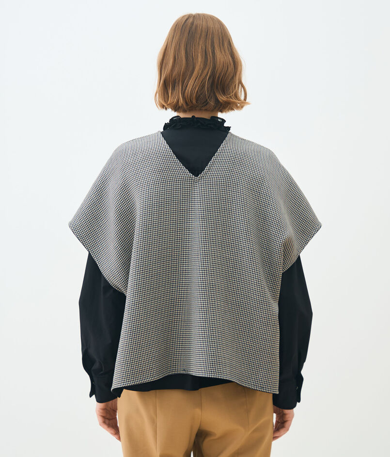 クラシカルなガンクラブチェック柄をベージュ系のカラーをベースにダークブラウン×ネイビーのカラー使いで表現した〈TOMORROWLAND collection〉のオリジナル素材を使用したマント。