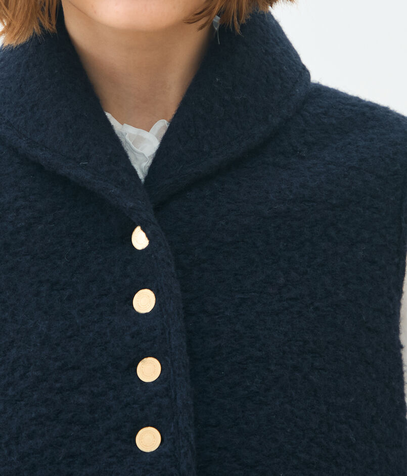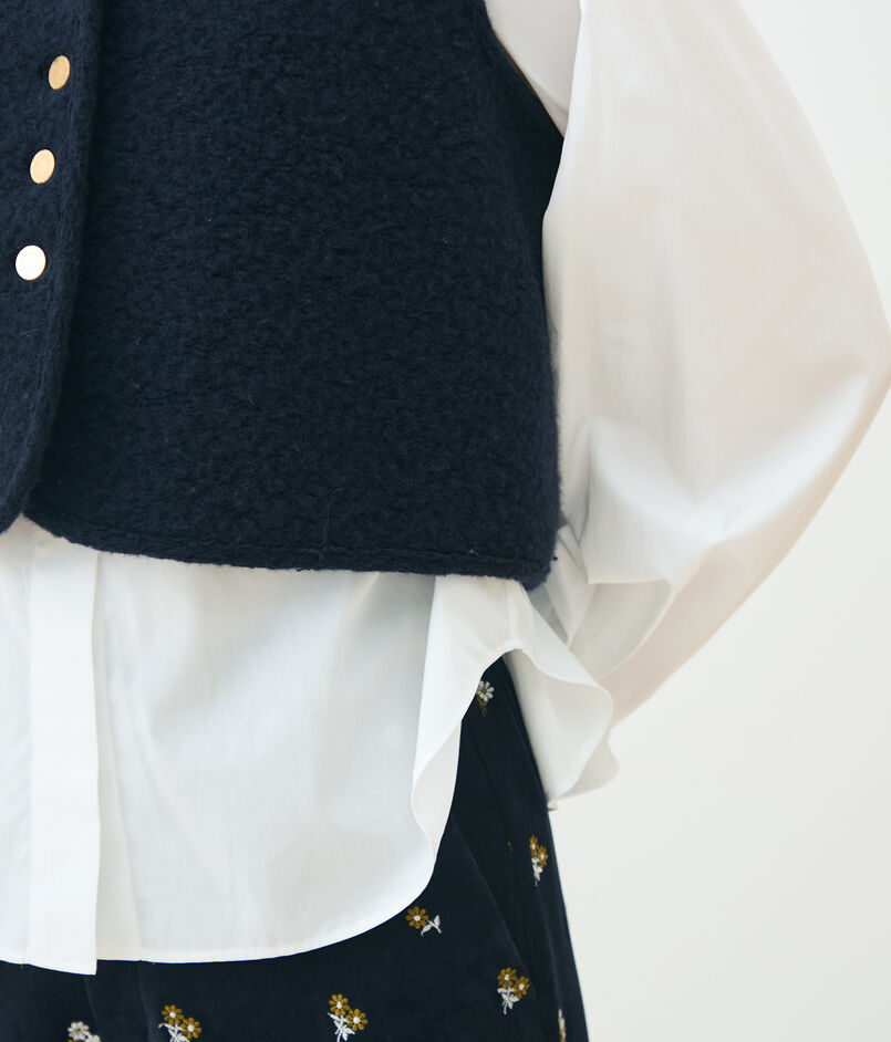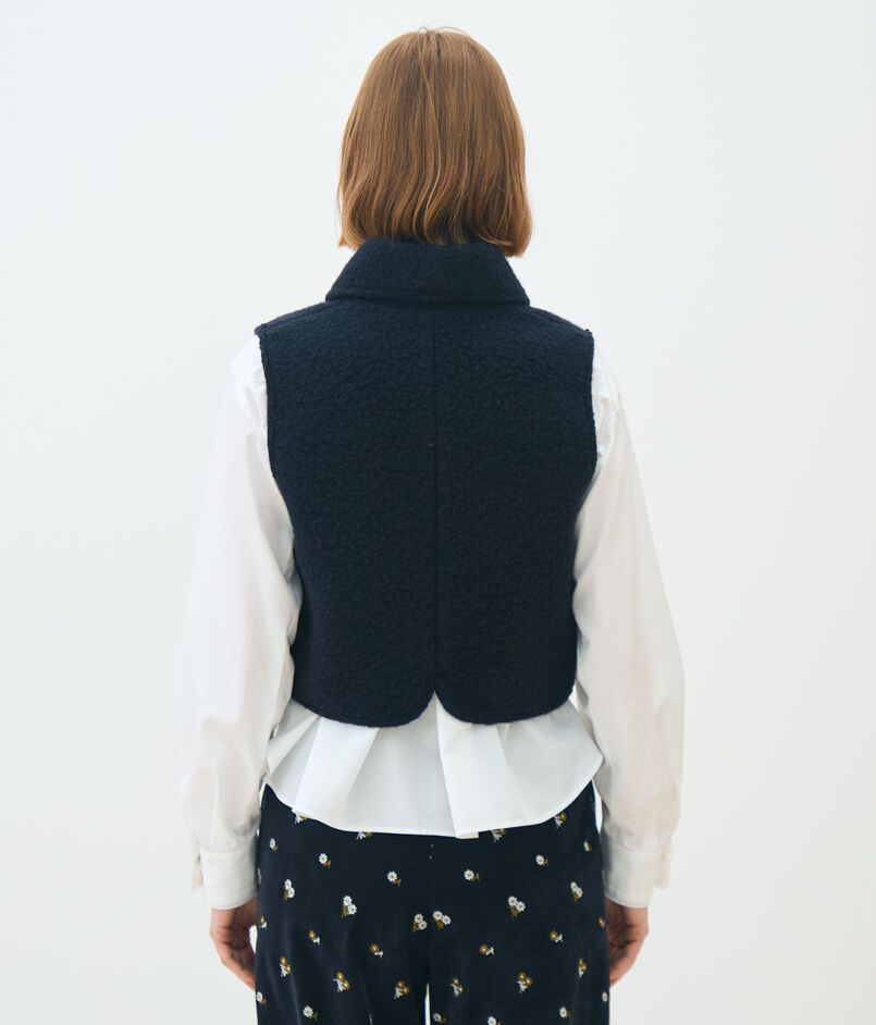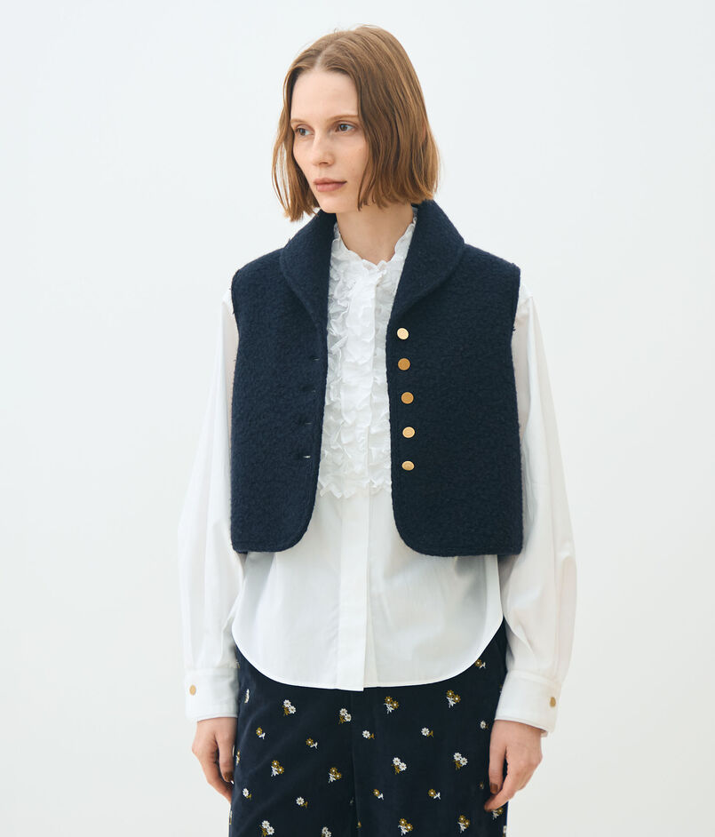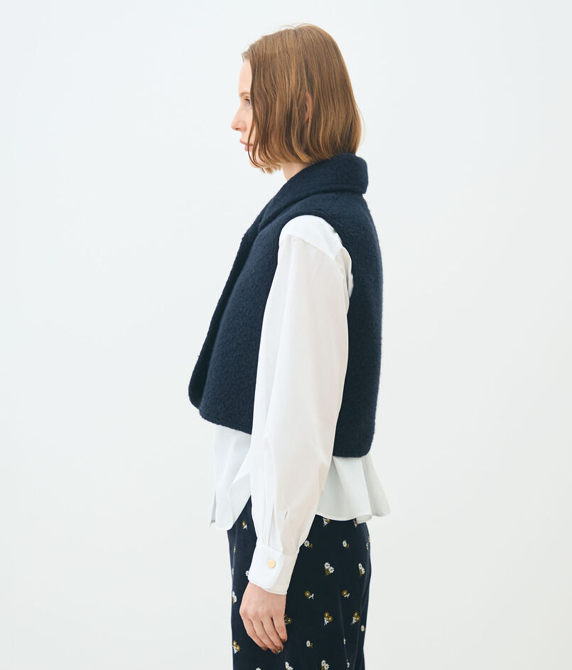 コンパクトなフォルムとショール風の襟でキュートな印象のジレ。