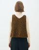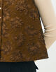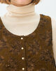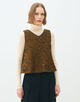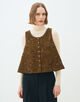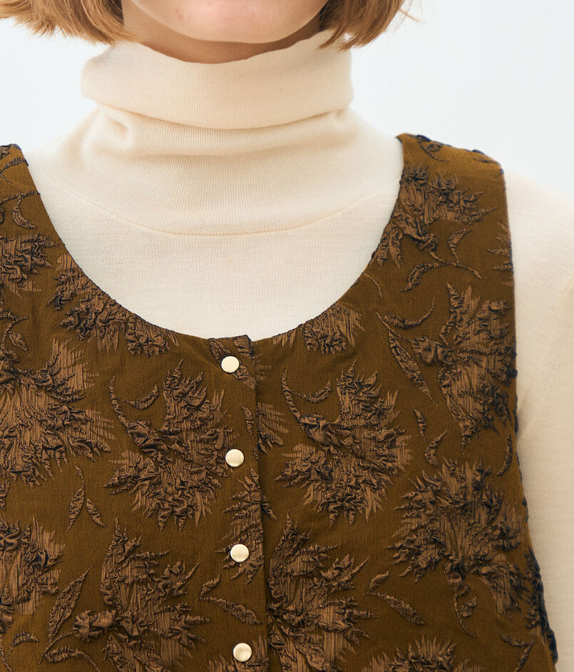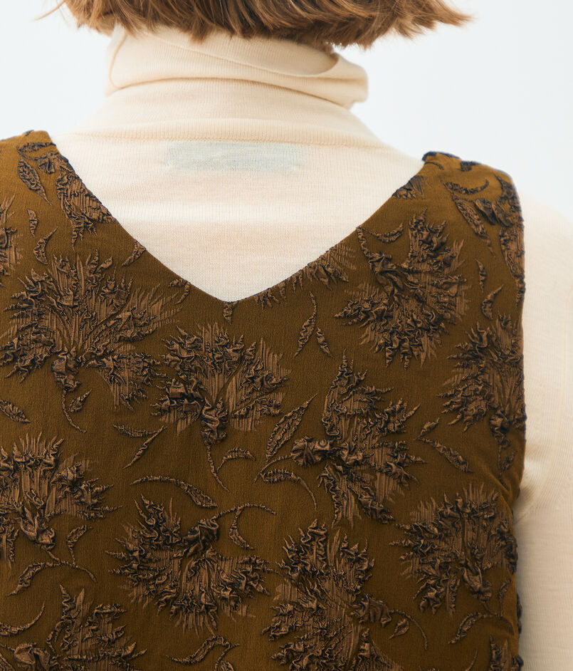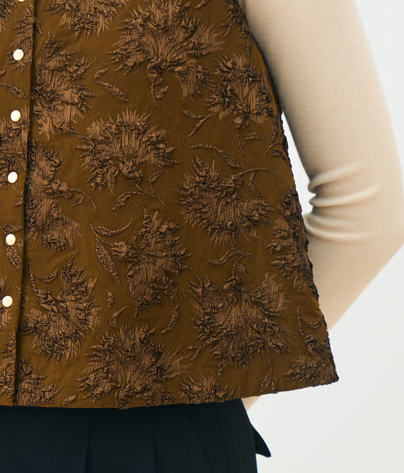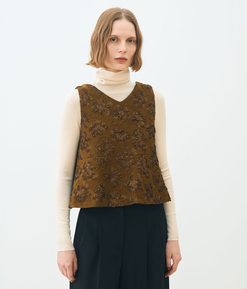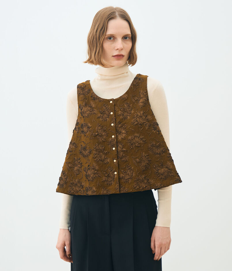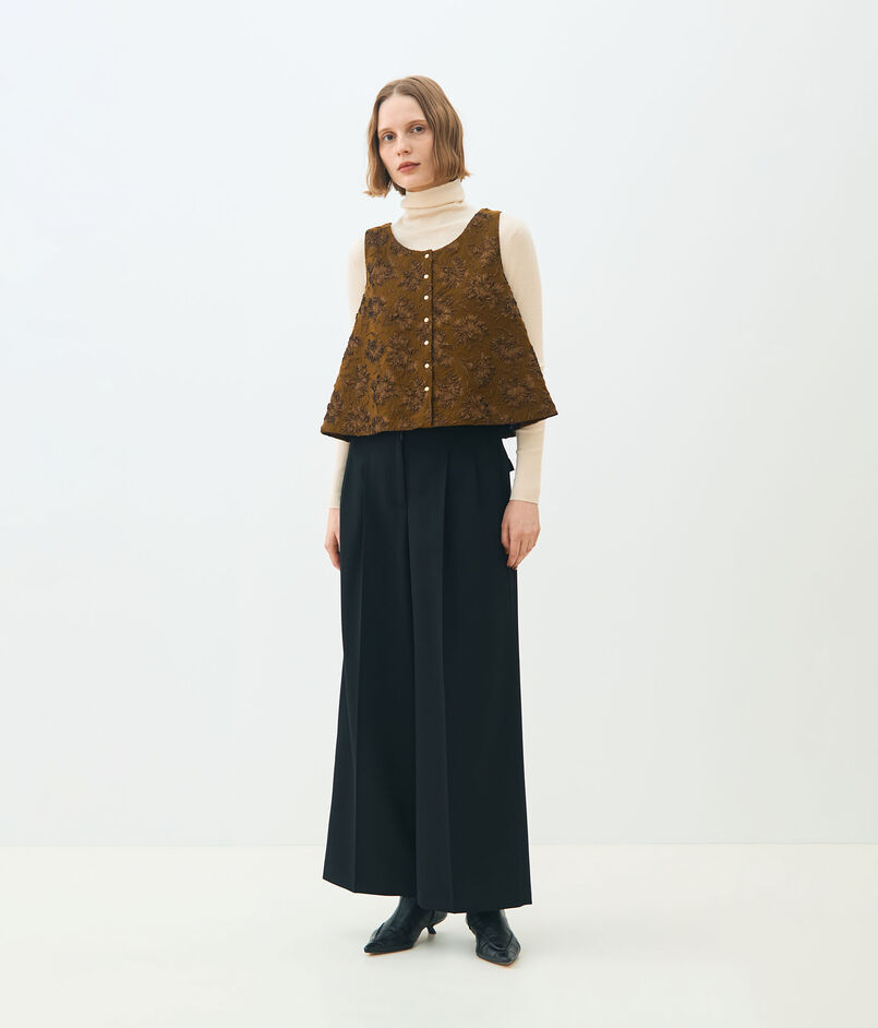ジレはバックの高めの切り替え位置から裾に向かって広がる緩やかなトラペーズラインで甘さをプラスした一着。