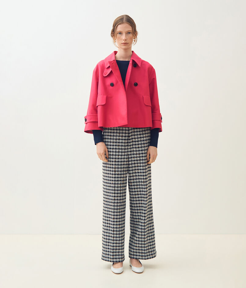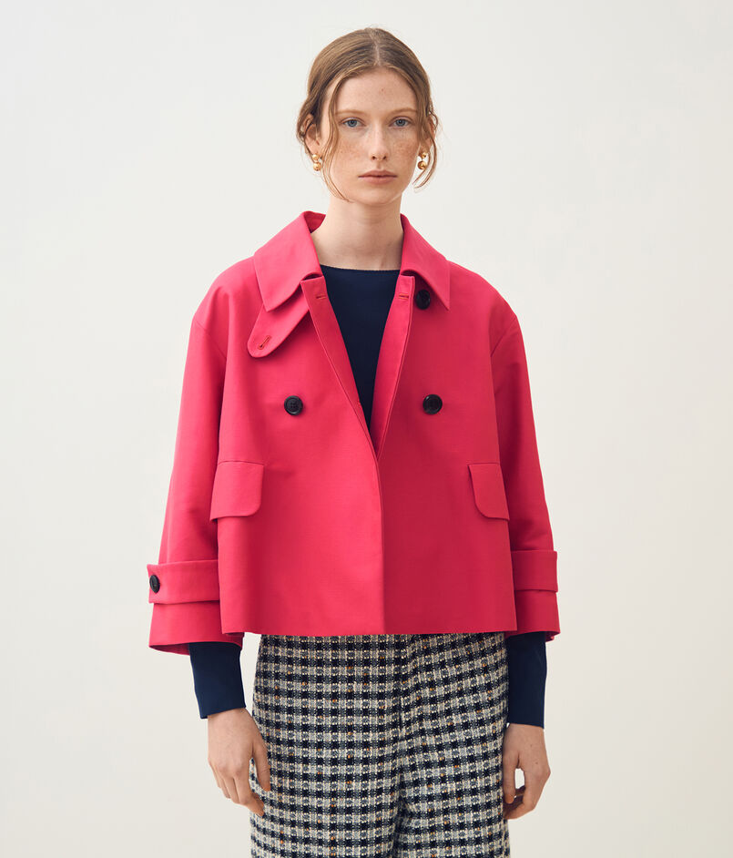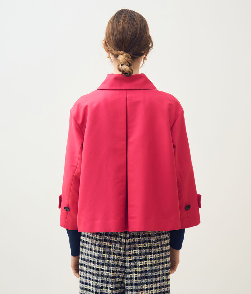 トレンチコートのディテールを持ちつつも、ショート丈にすることでクラシックさとモダンさを両立させたジャケット。