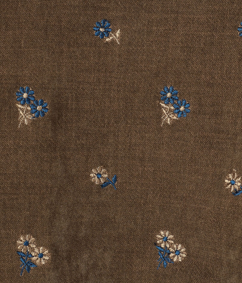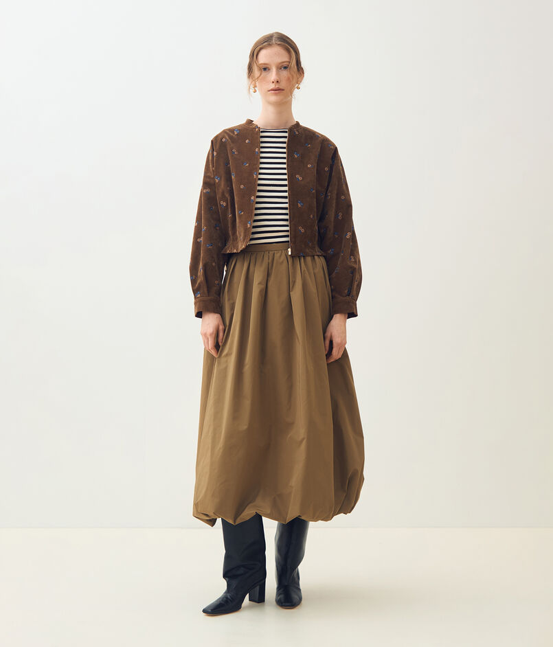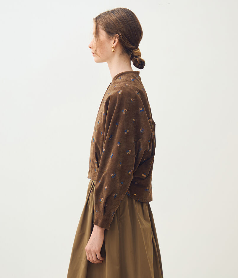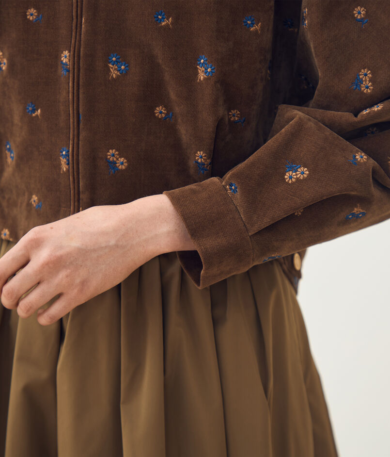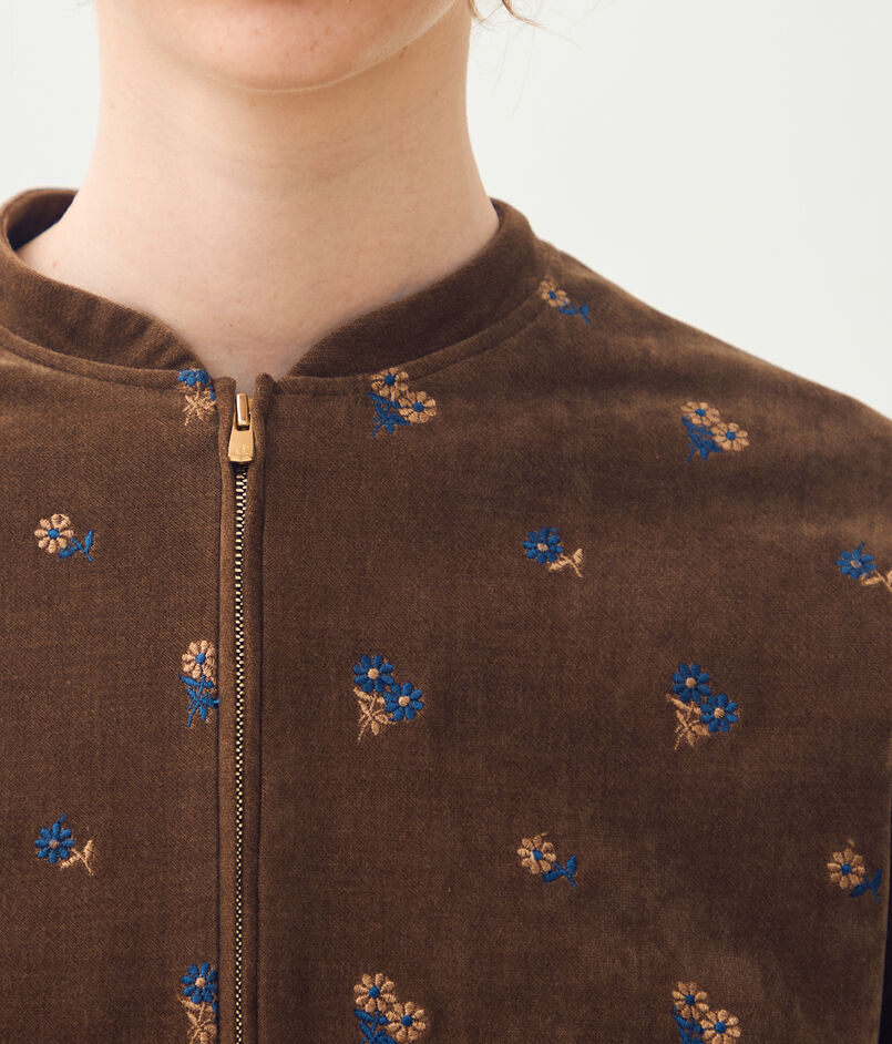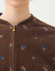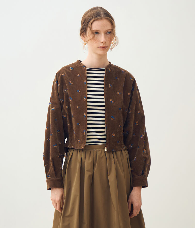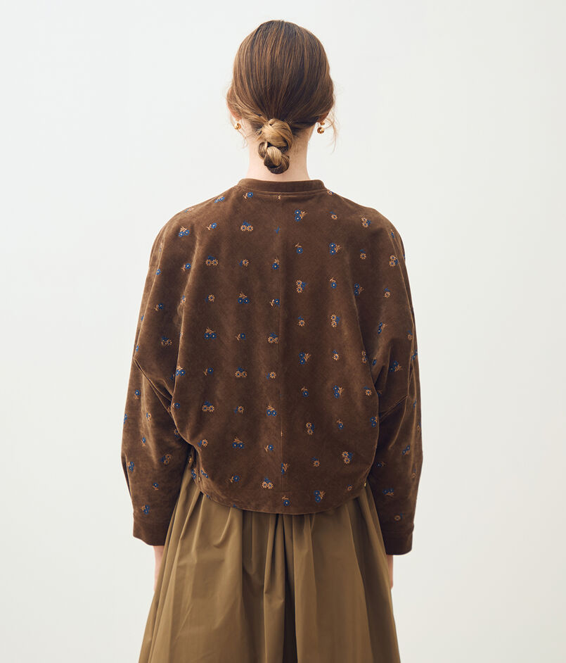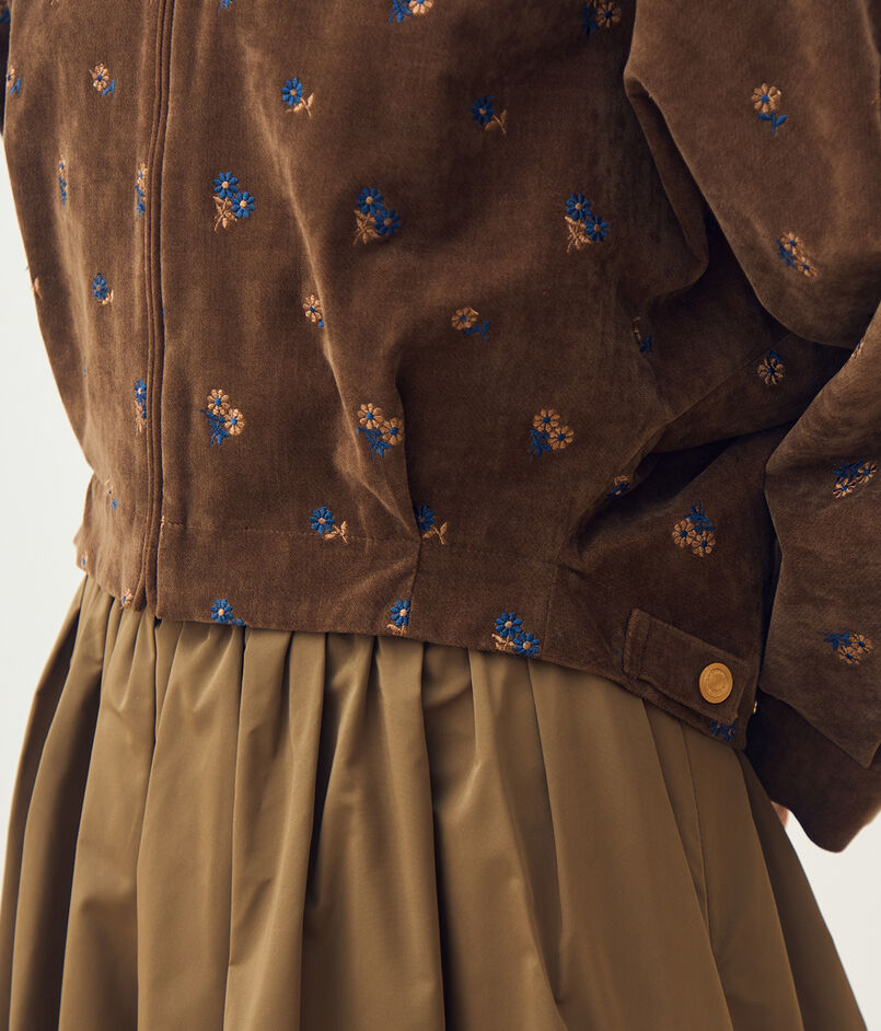 やわらかな印象のベルベット生地に、レトロな雰囲気漂うマーガレット柄の刺繍を散りばめた〈フルーロンベル〉シリーズのブルゾン。