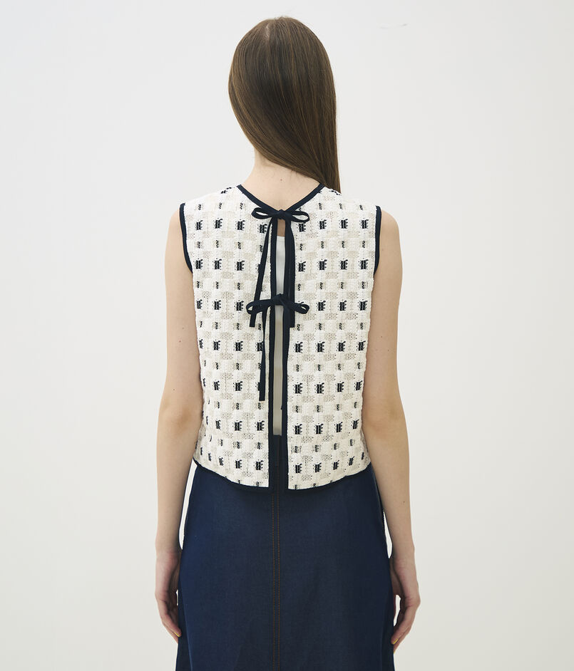 コンパクトなフォルムでミニマルな印象ながら、大胆なオープンバックのデザインで抜け感をプラスした一着。