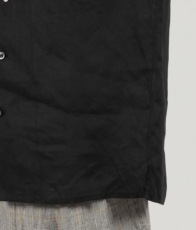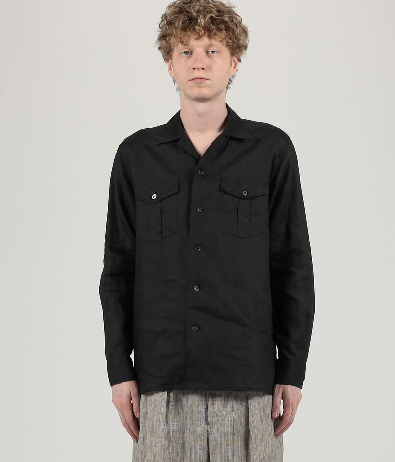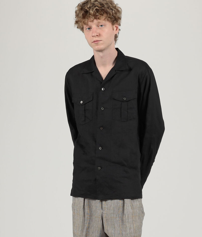 1912年創業のアイルランド老舗メーカー〈BAIRD MCNUTT(ベアードマクナット)〉社のリネン100%の素材を使用したダブルポケットデザインのオープンカラーシャツ。