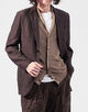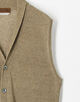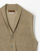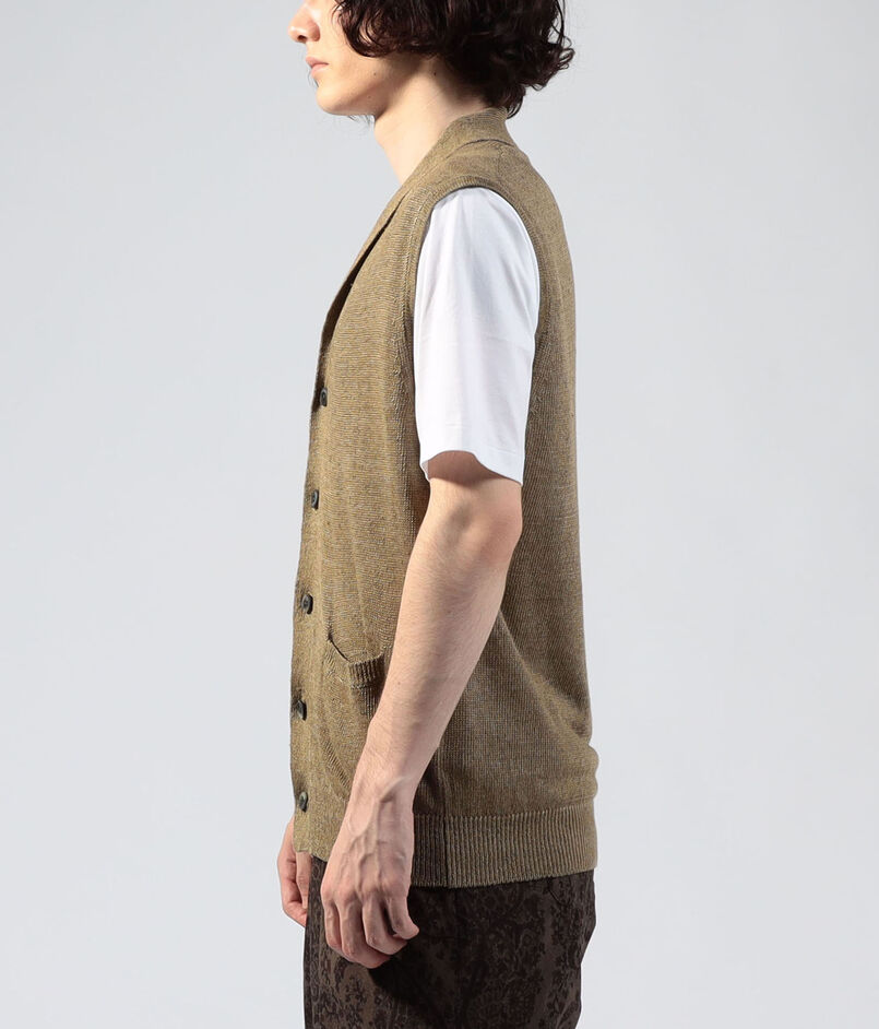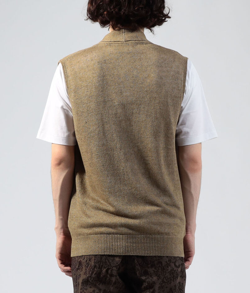 小襟のショールカラーニットベスト。ネックの収まりを考慮して編まれたショールやジャケットを羽織ることを想定したサイズ感など、細かな箇所にこだわりの詰まった1着。
