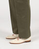 通常ウール素材を乗せるようなクラシックな2プリーツの本格スラックスをベースに、太めのシルエットに変更し、ステッチ入りのベルトループを盛り込みました。