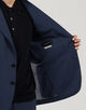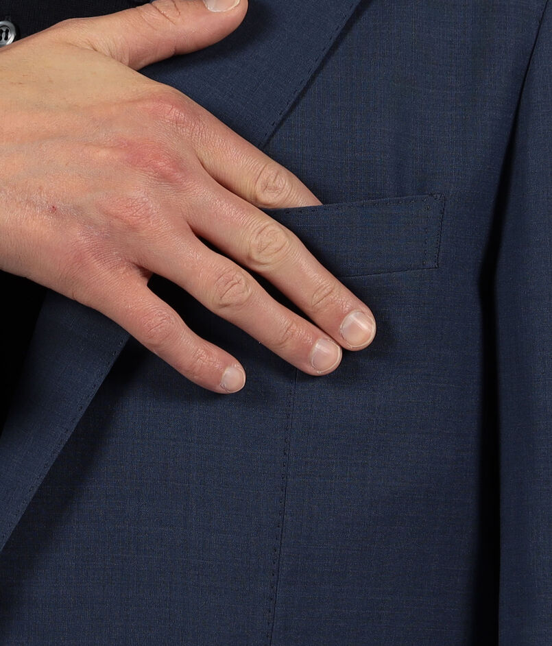 ビジネスシーンを想定し胸周りにタスキ皺が入らない様、薄い毛芯を一枚入れて保形性を高めています。