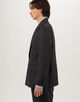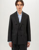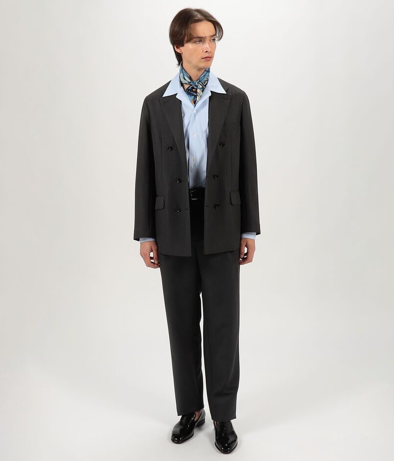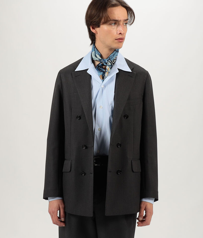 シルクにモヘヤを掛け合わせ、素材由来の上品な光沢とモヘヤの軽やかな張りが特徴の〈TOMORROWLAND PILGRIM〉レーベルのダブルブレステッドジャケット。