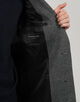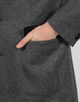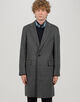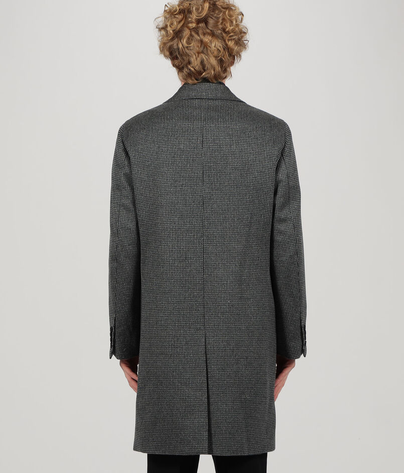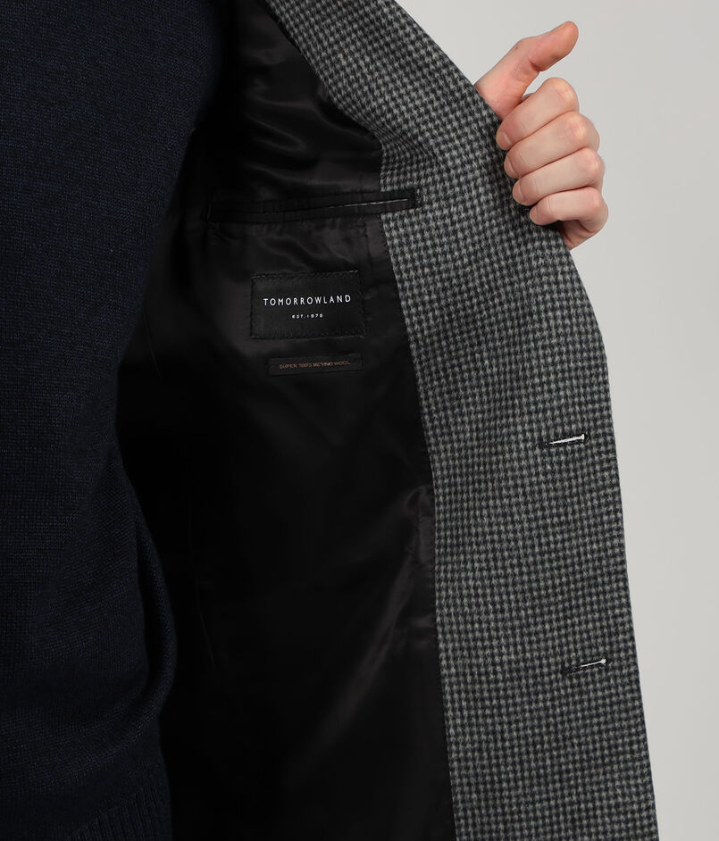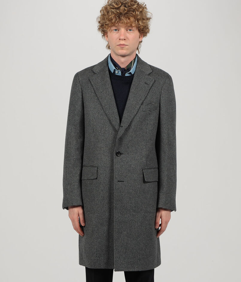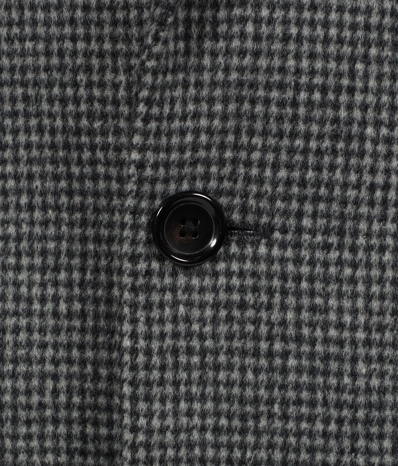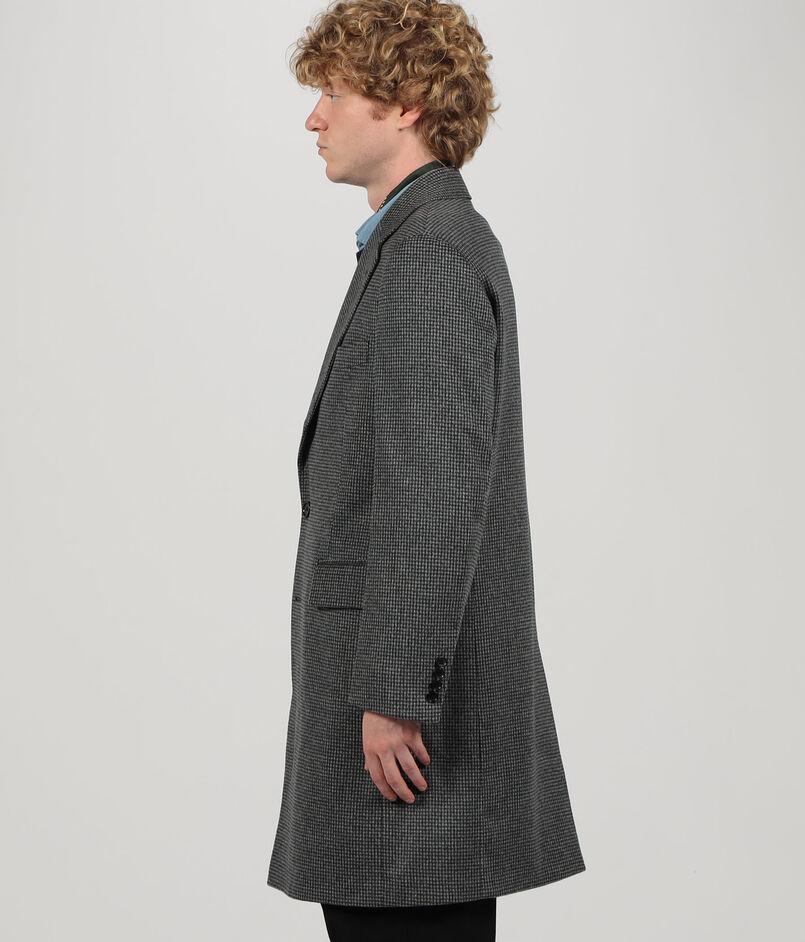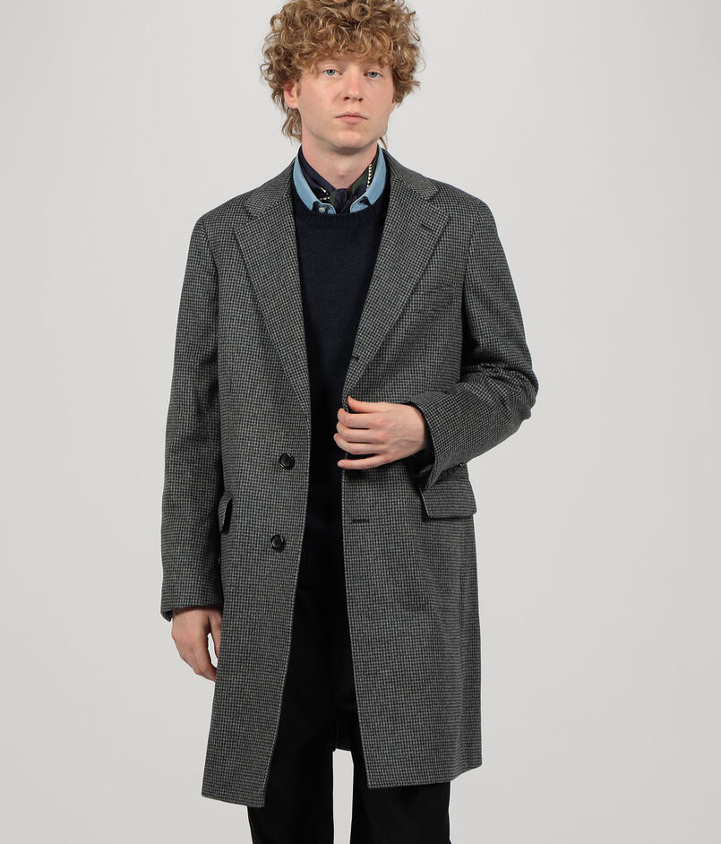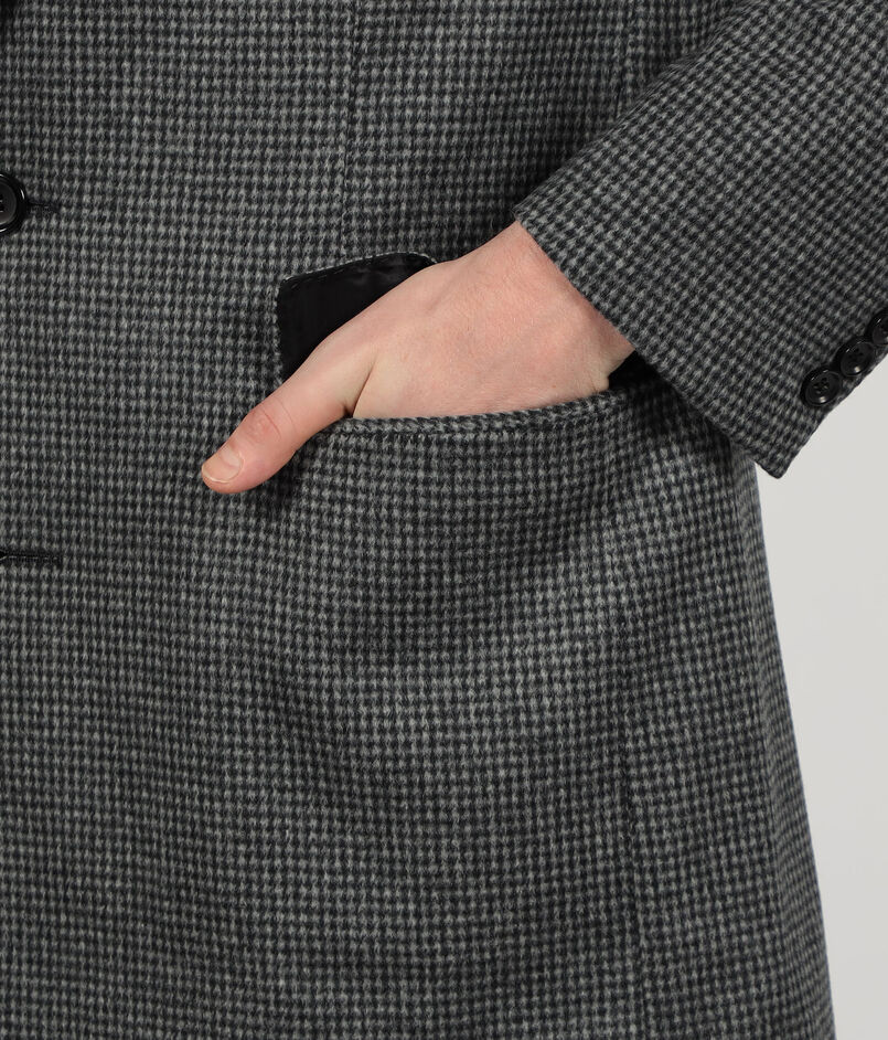 デザインは、ややローゴージで広めのラペル設定のモダンなチェスターフィールドコート。