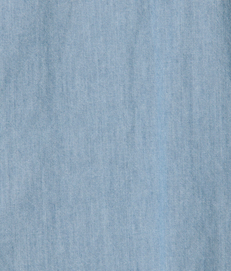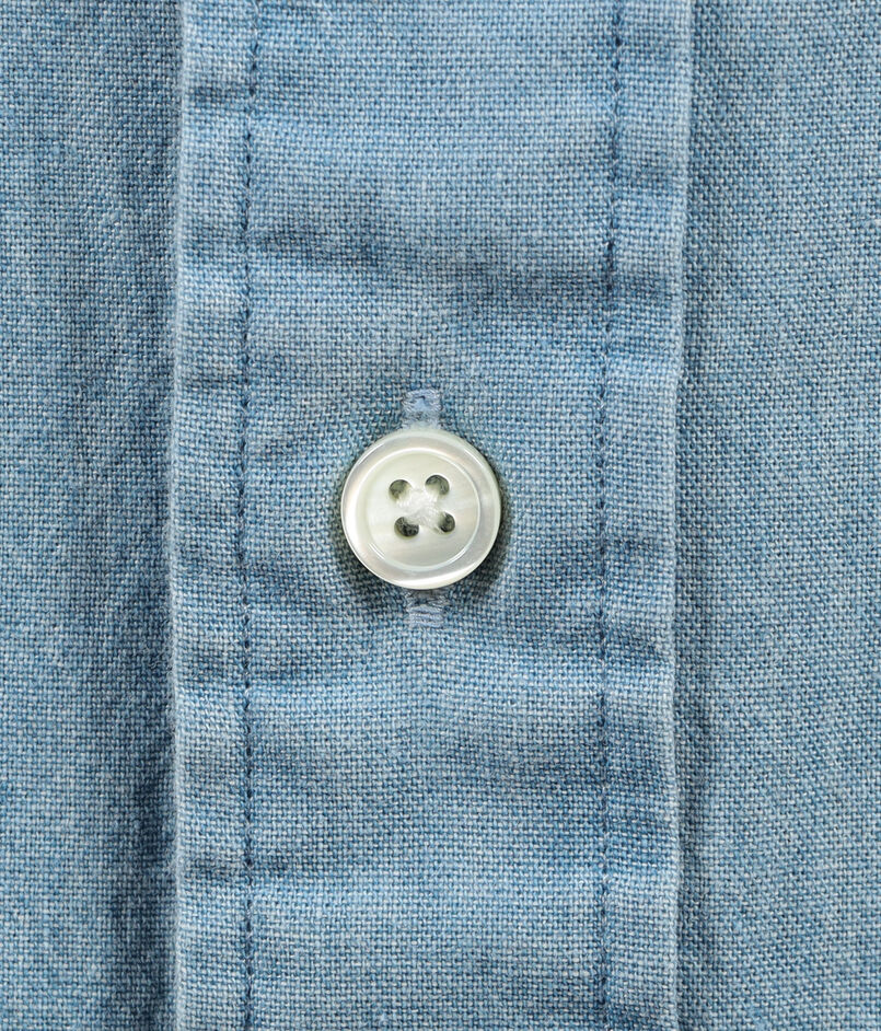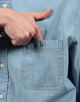 ムラ糸使いのダンガリー素材にストーンバイオウォッシュのブリーチ加工をかけています。