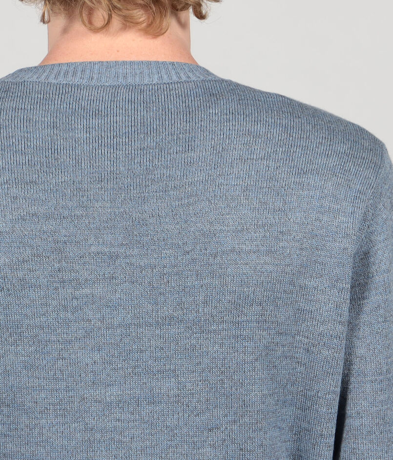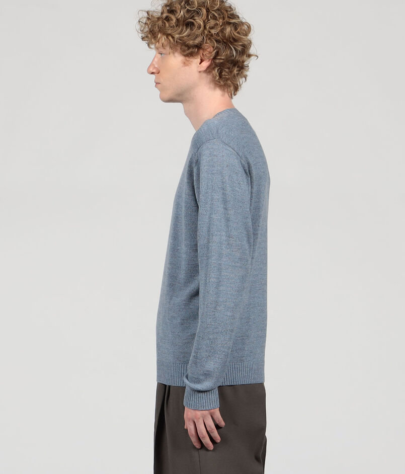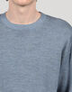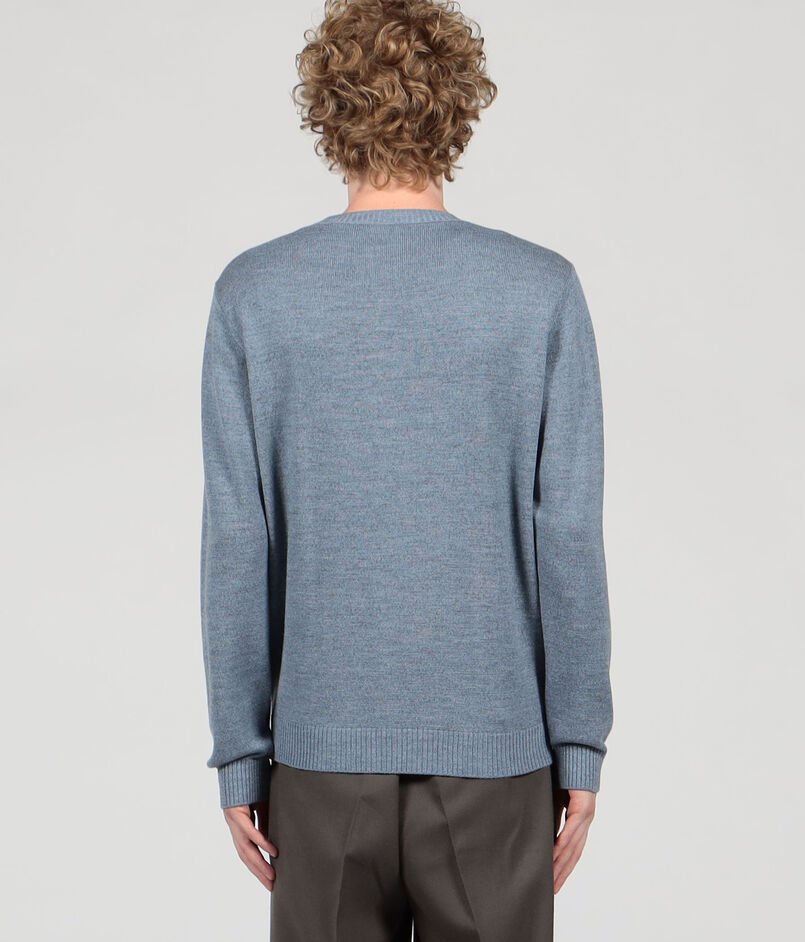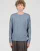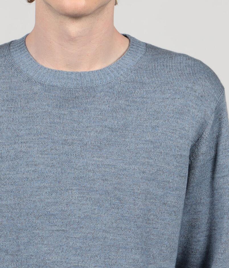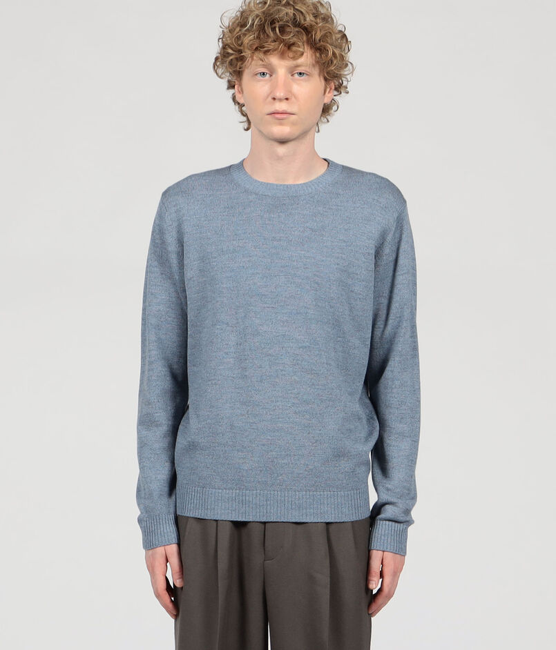 暖かさとスタイルを両立するオリジナル原料のミドルゲージのクルーネックニット。