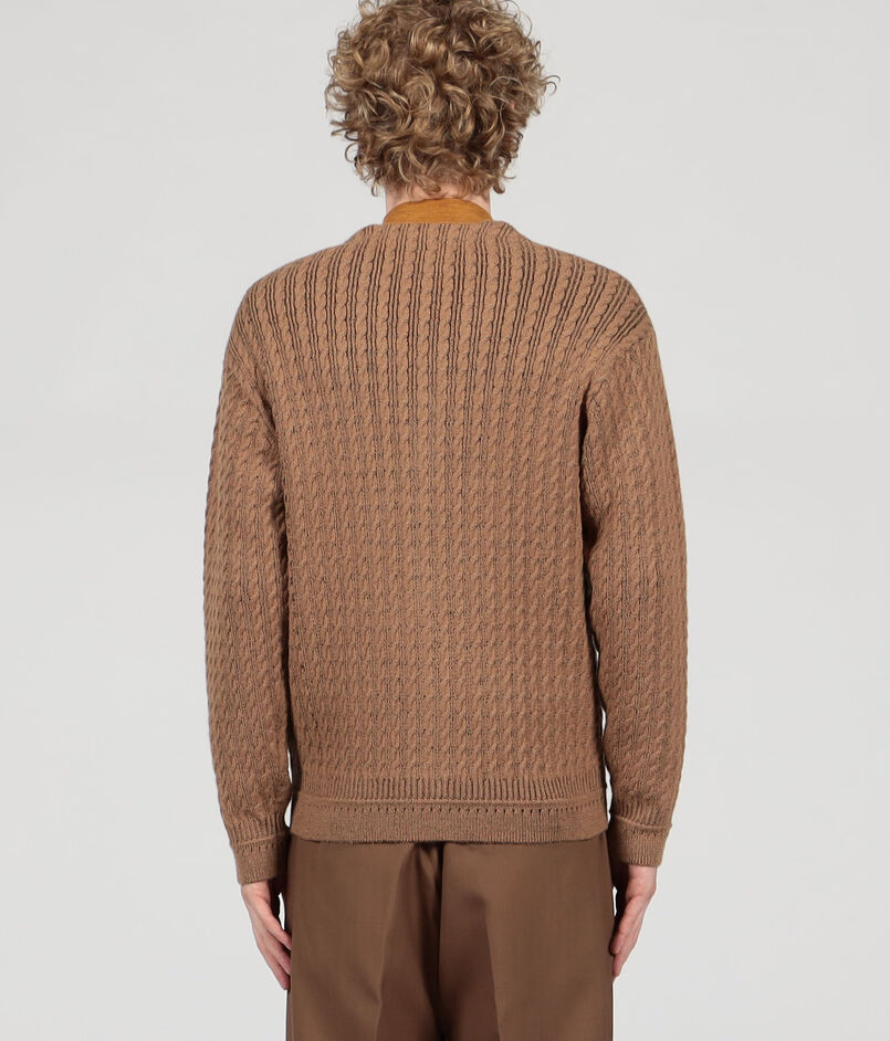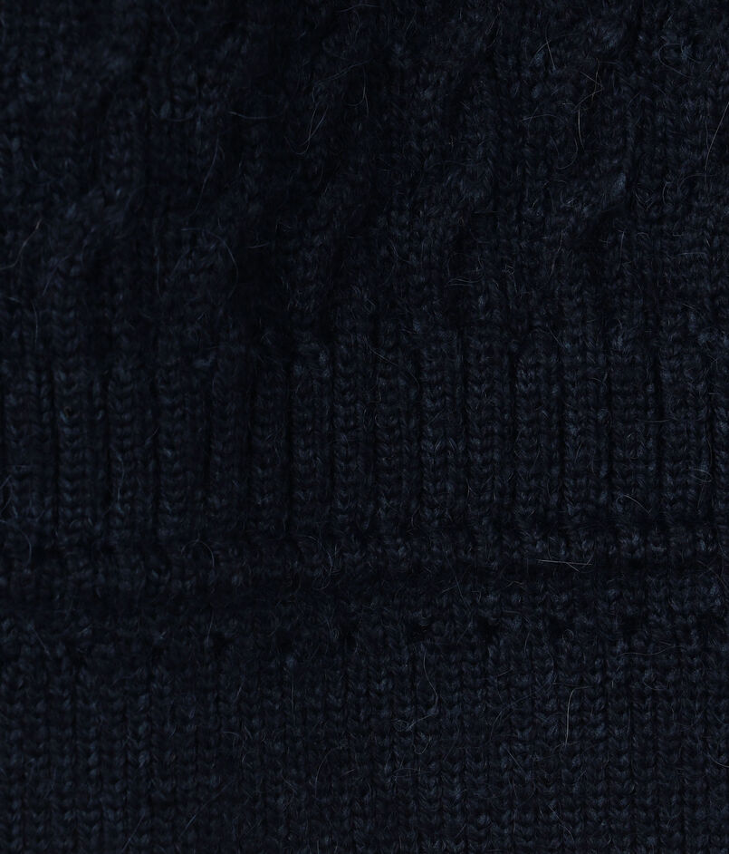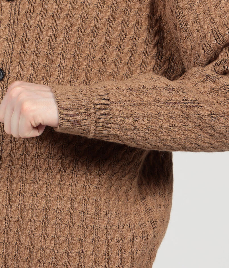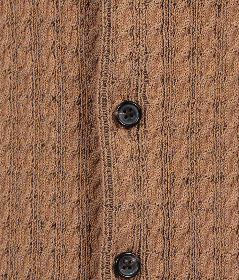デザインは、クラシックなブリティッシュケーブルニットを踏襲したVネックカーディガン。
