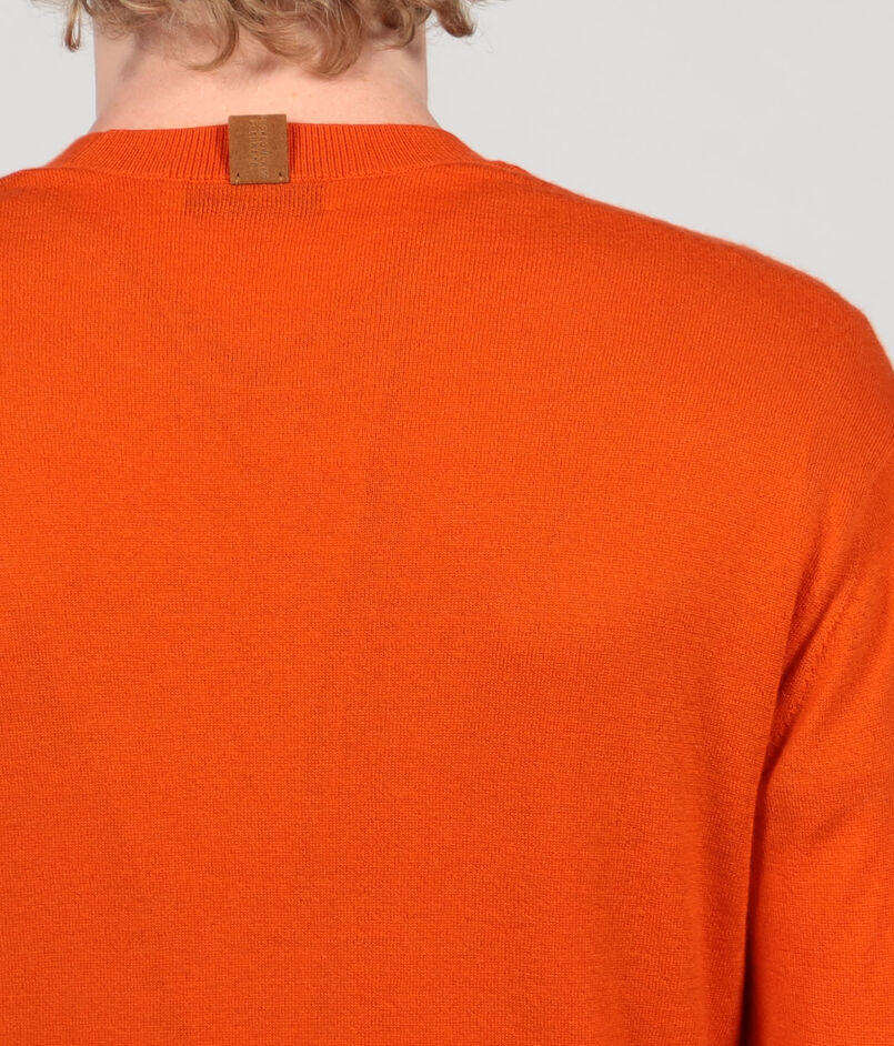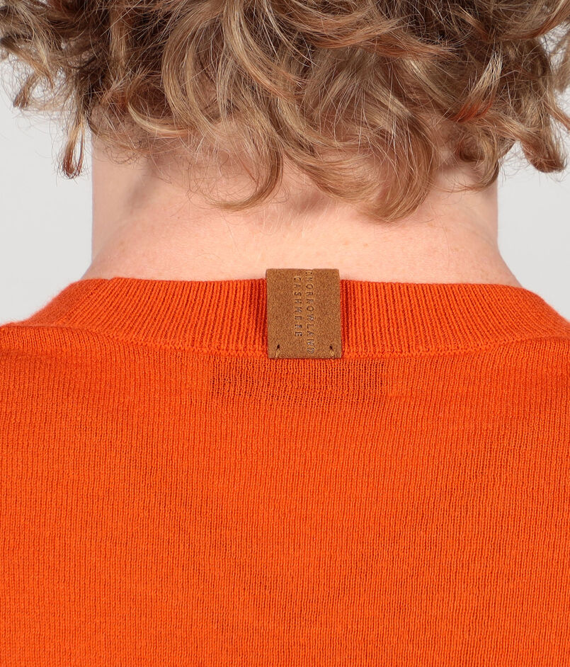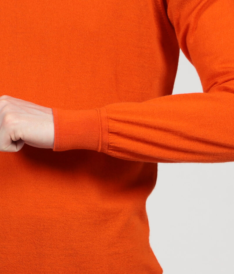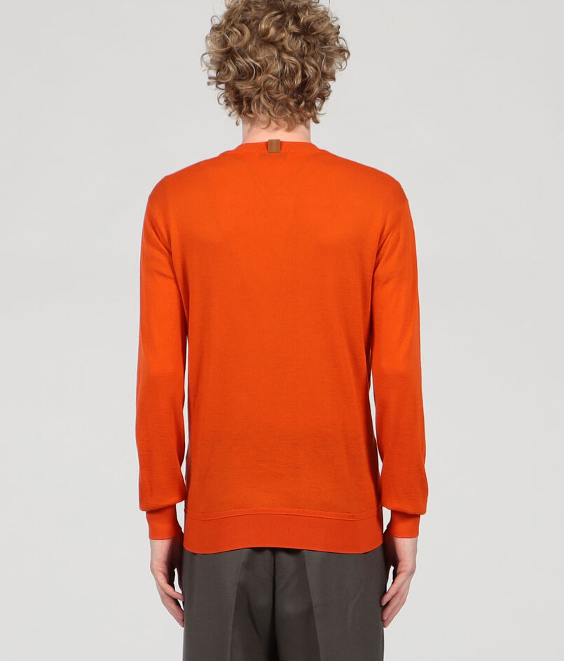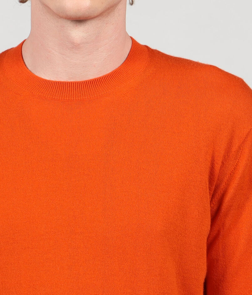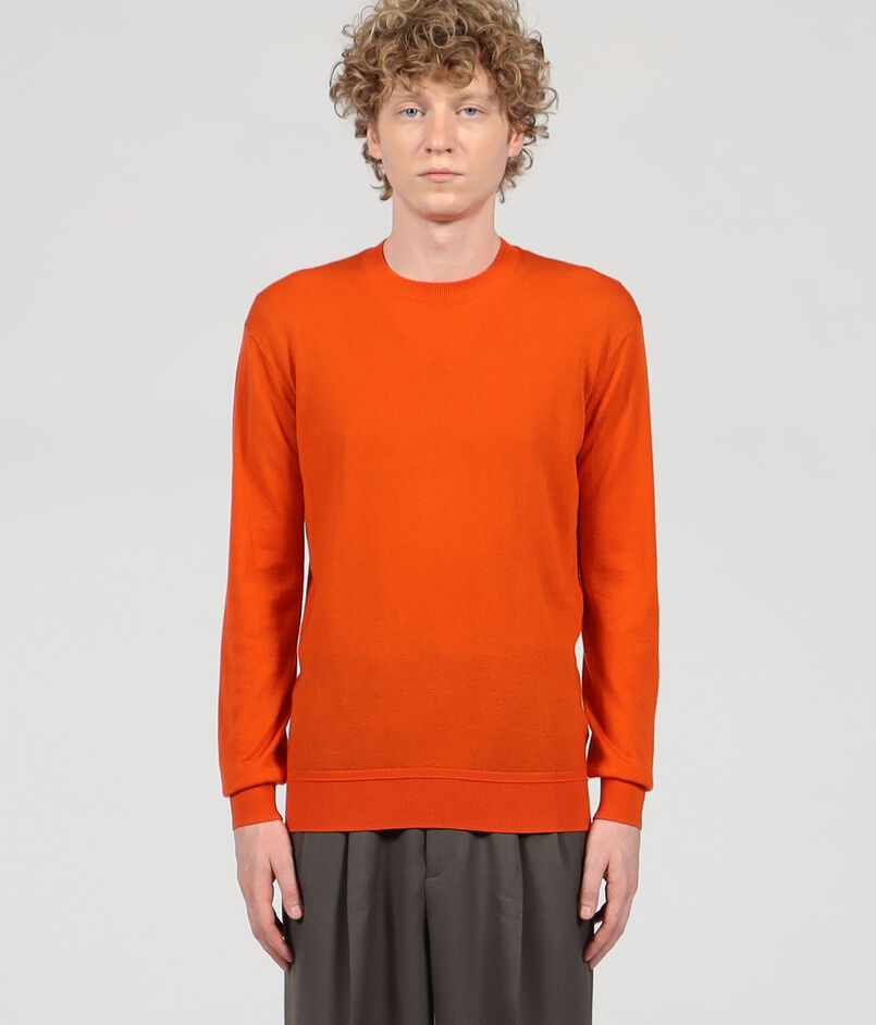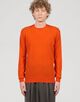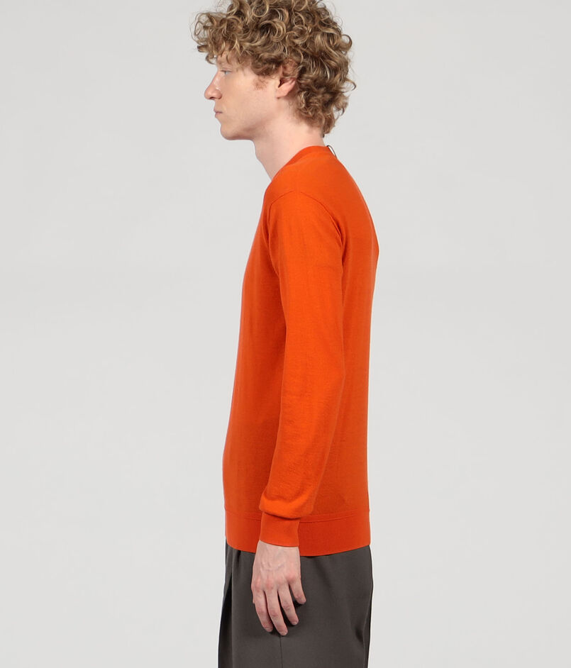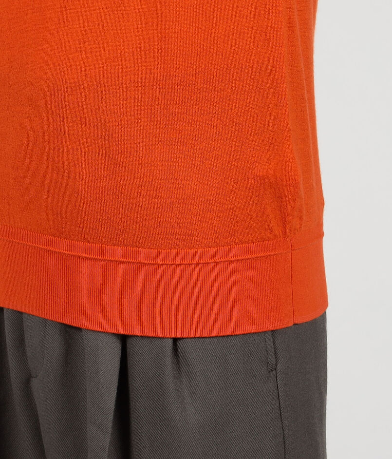 カシミヤでは珍しい梳毛カシミヤ100%の細番手糸で作られたクリーンなクルーネックニット。