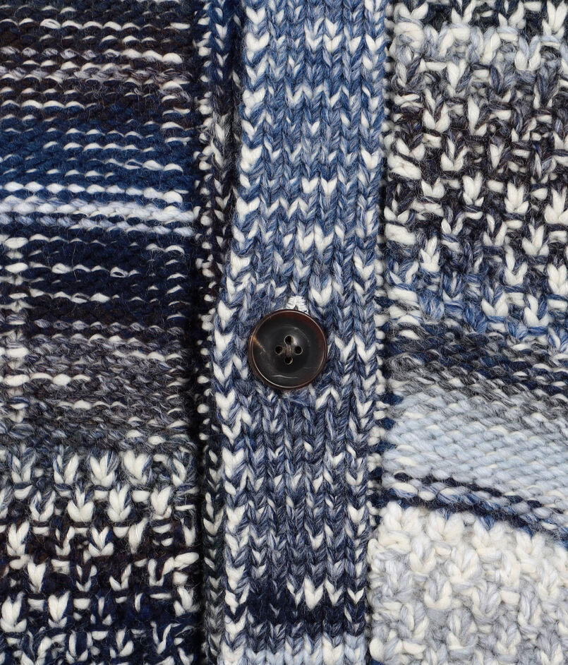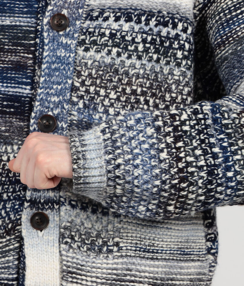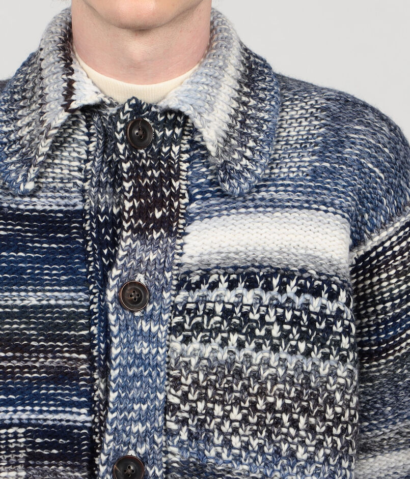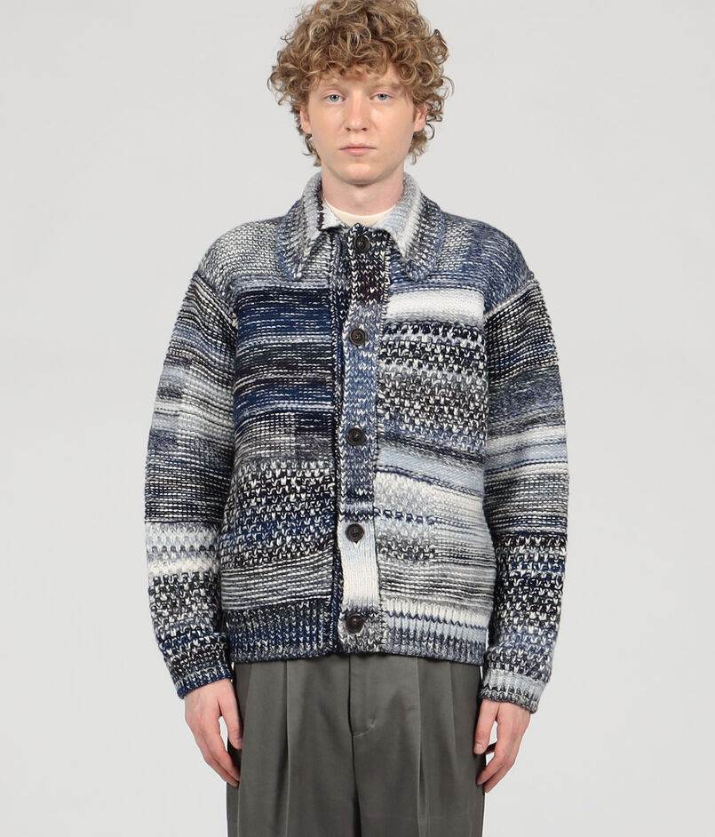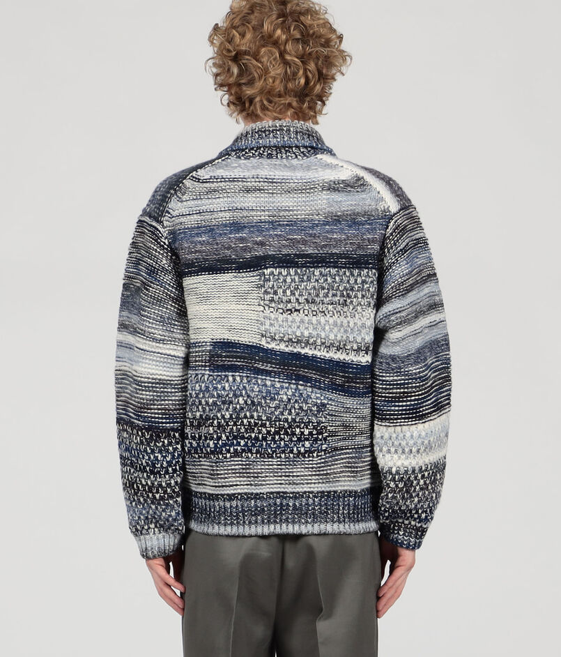 数種類の変化のある編地をモンドリアン調のパッチワークのように組み合わせたニットブルゾン。