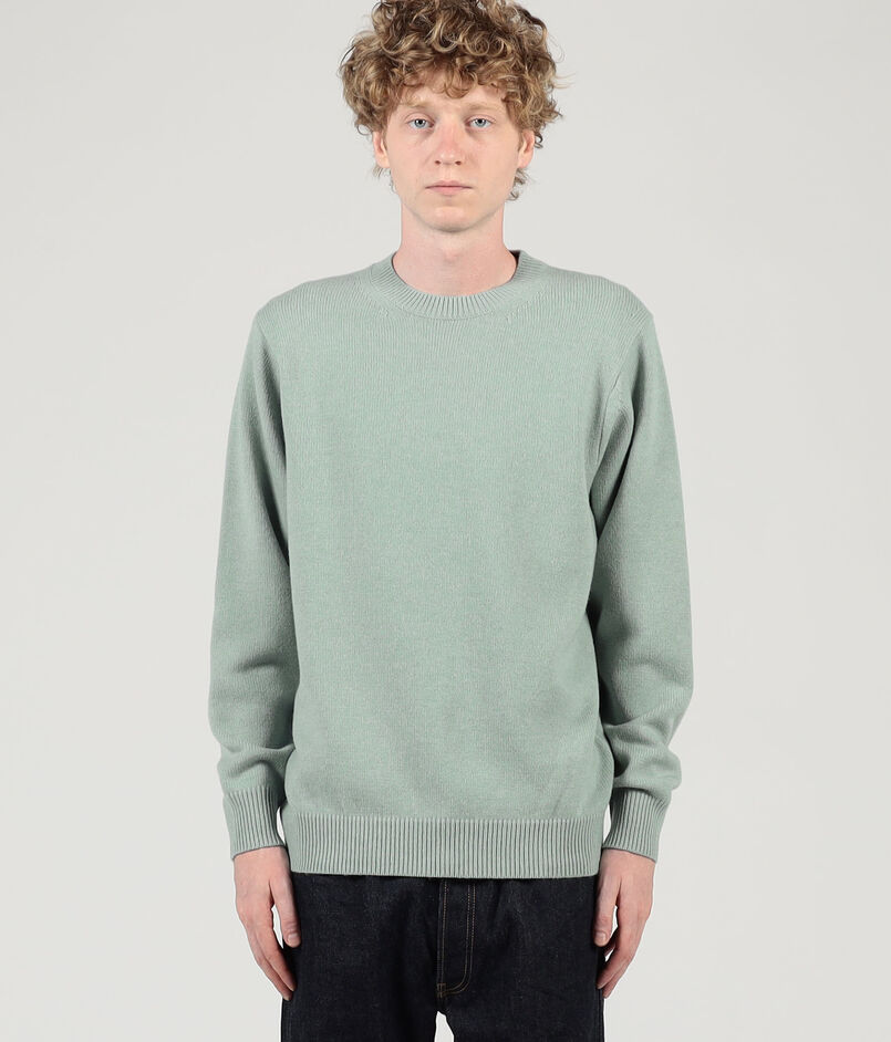 ニットらしいリブを残しながら、身幅、肩幅、袖幅を調整して、トレーナーライクのカジュアルなクルーネックに仕上げています。