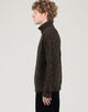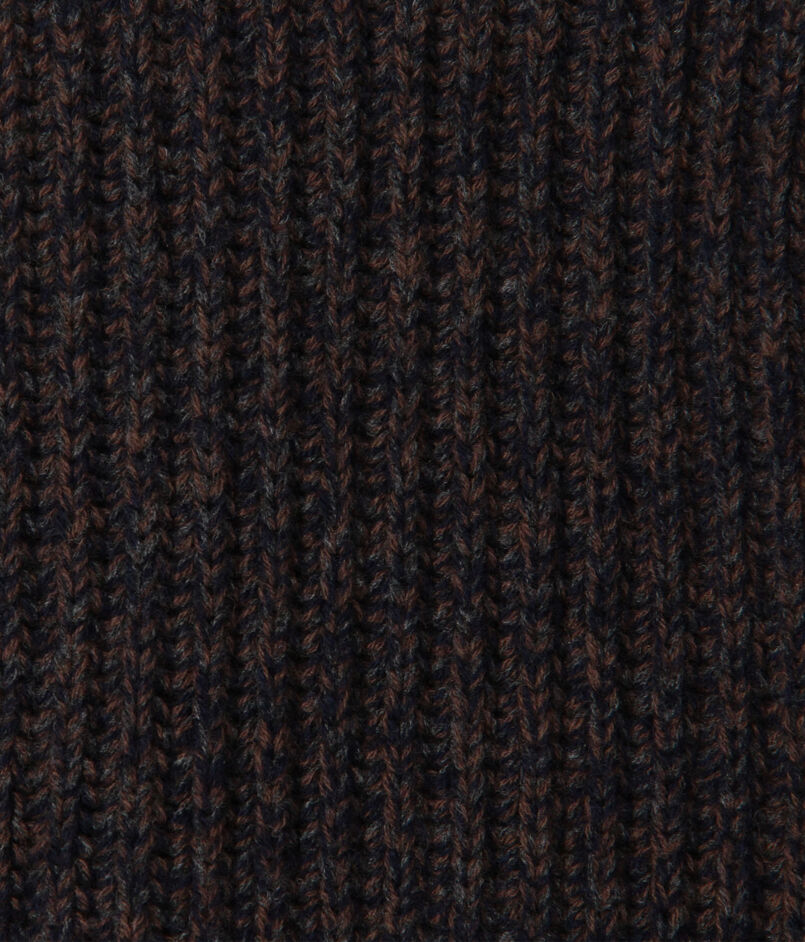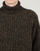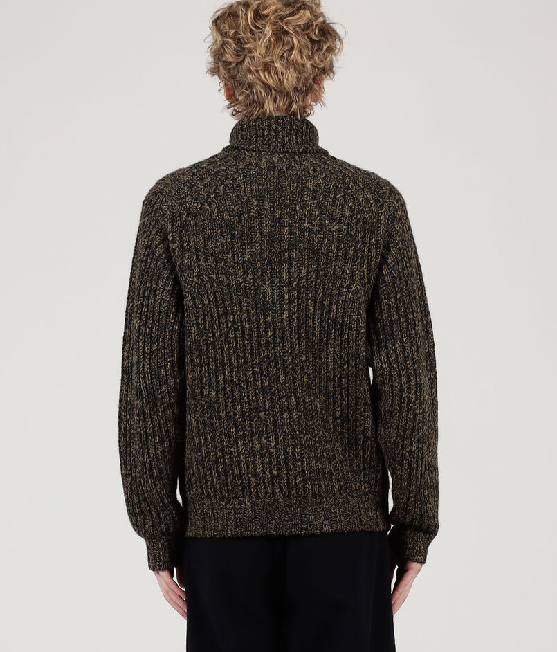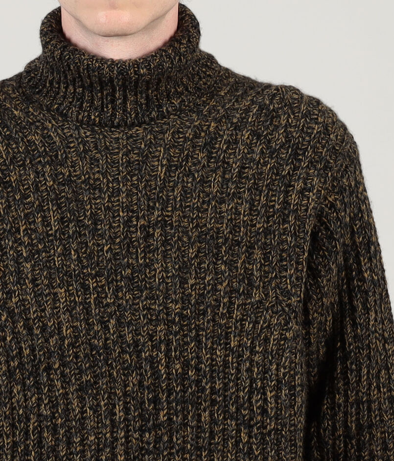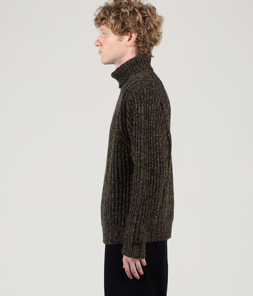 軽さが特徴のオーストラリアのウルトラファインメリノウールにカシミヤをブレンドした紡毛糸を使用したリブ編みのタートルネックニット。