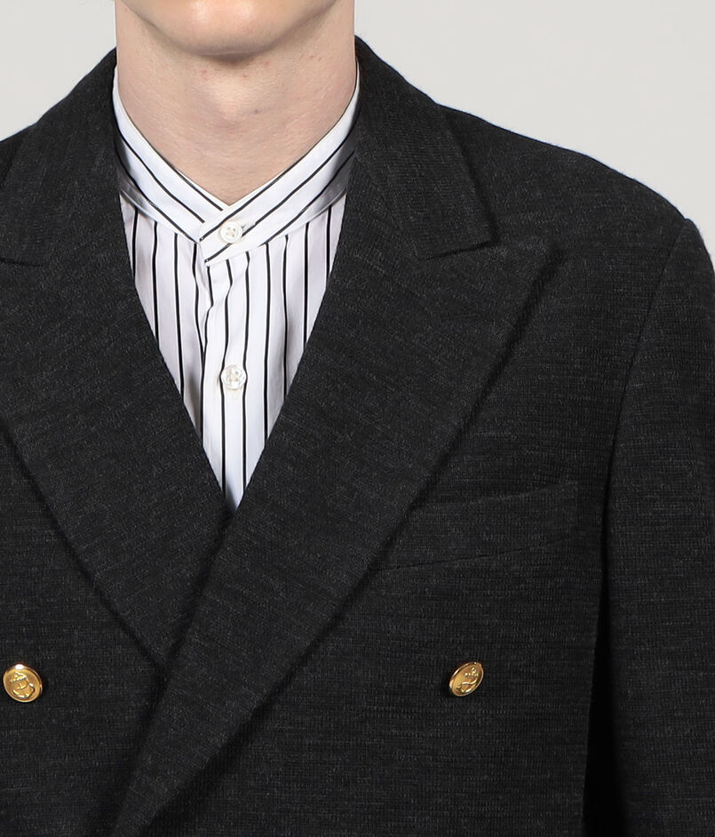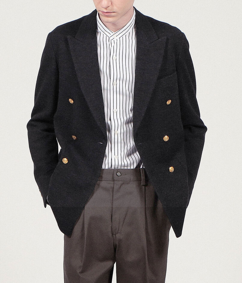 重厚感のあるダブルブレステッドを、カーディガンのような軽い仕立てを採用。