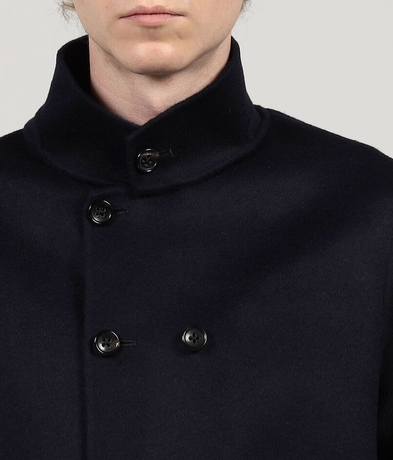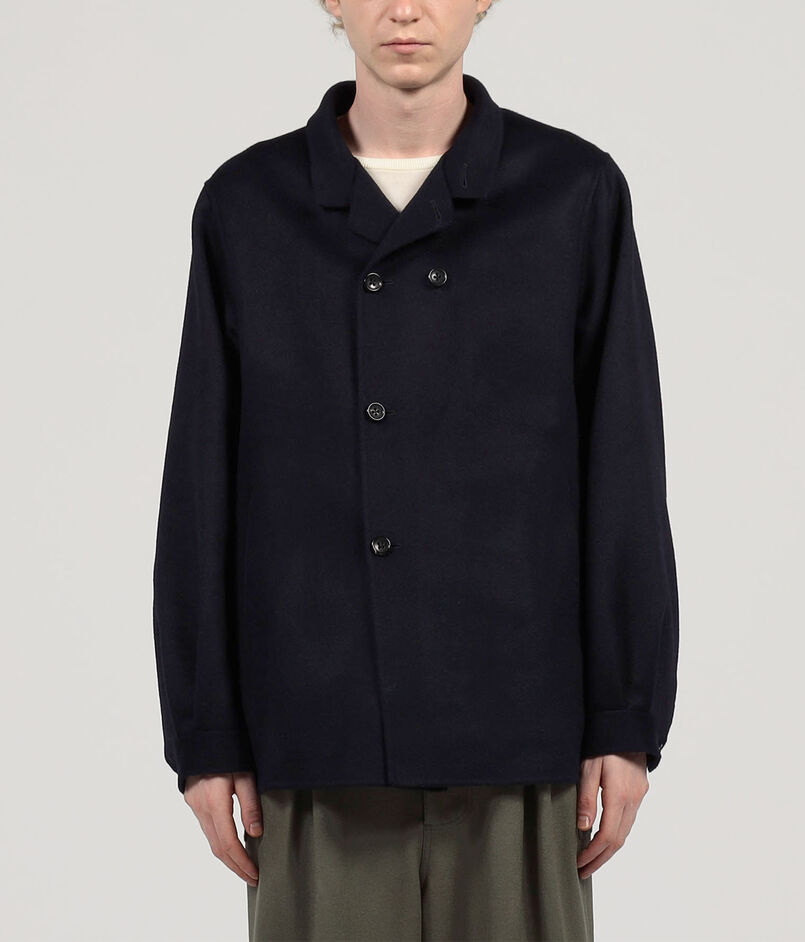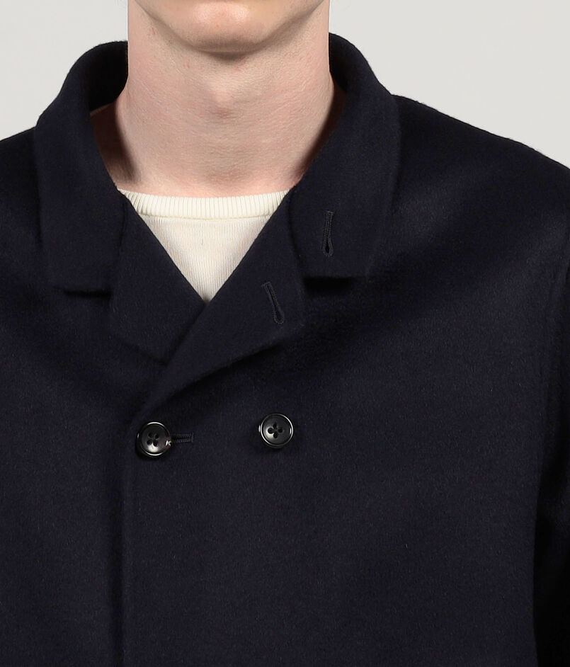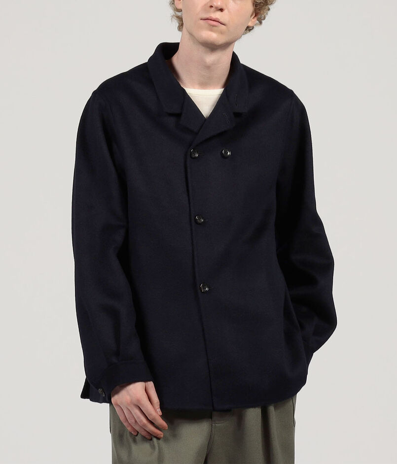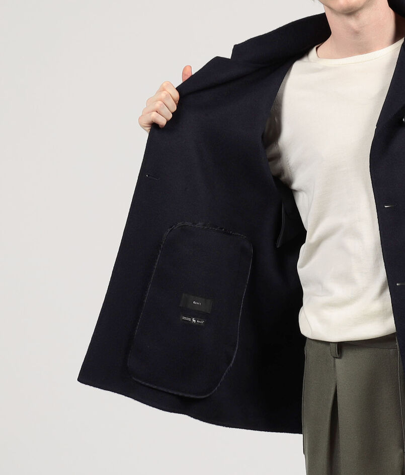 変形のダブルブレストのデザインで、襟を立てても寝かせても着用して頂けます。