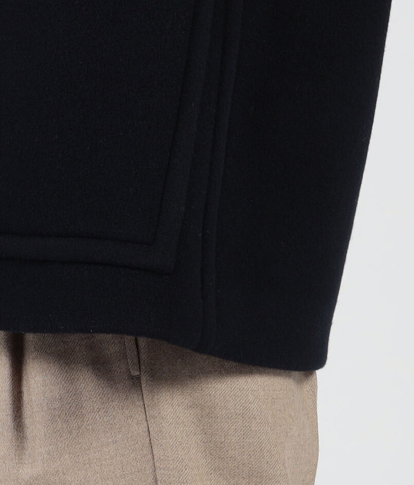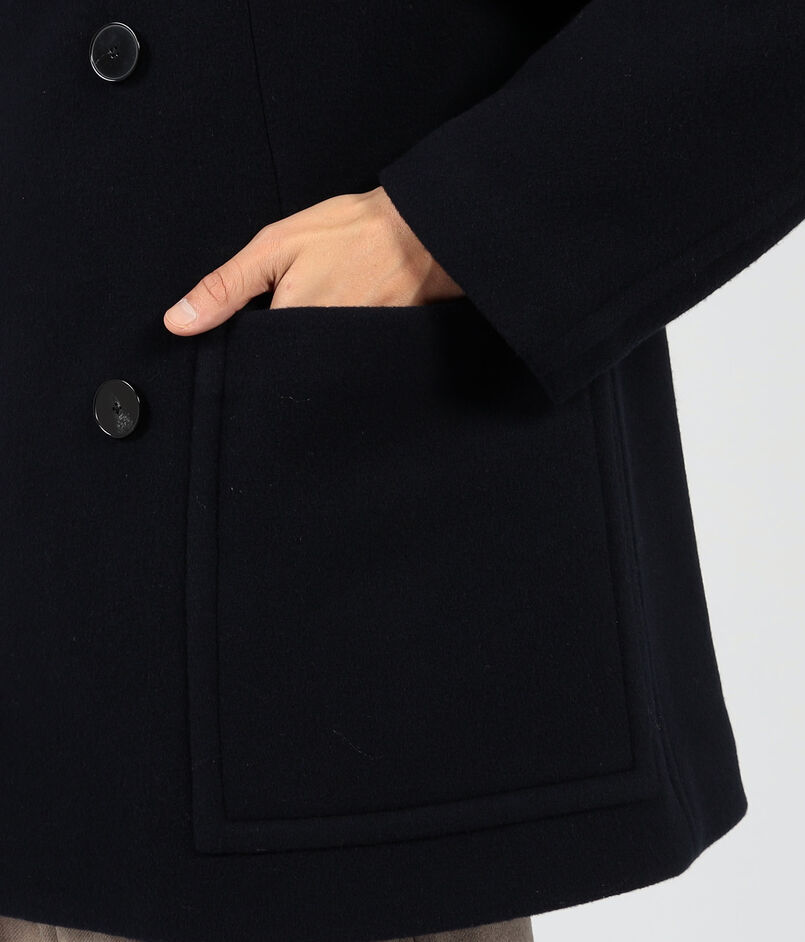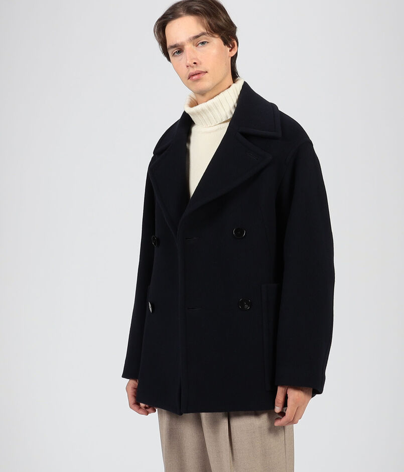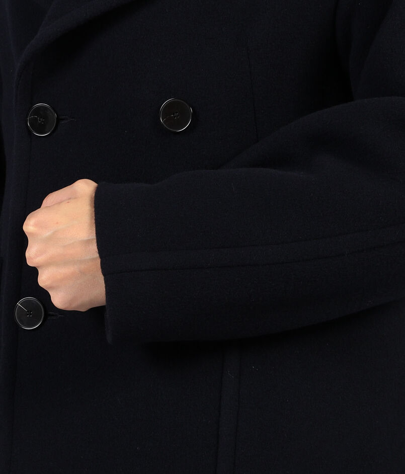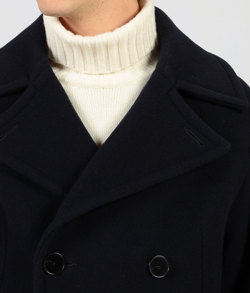 ラムウールを超細番手の「Super140’S」まで繊細に製糸したウール原料を二重織組織で織り上げたモッサー生地を使用したPコート。