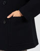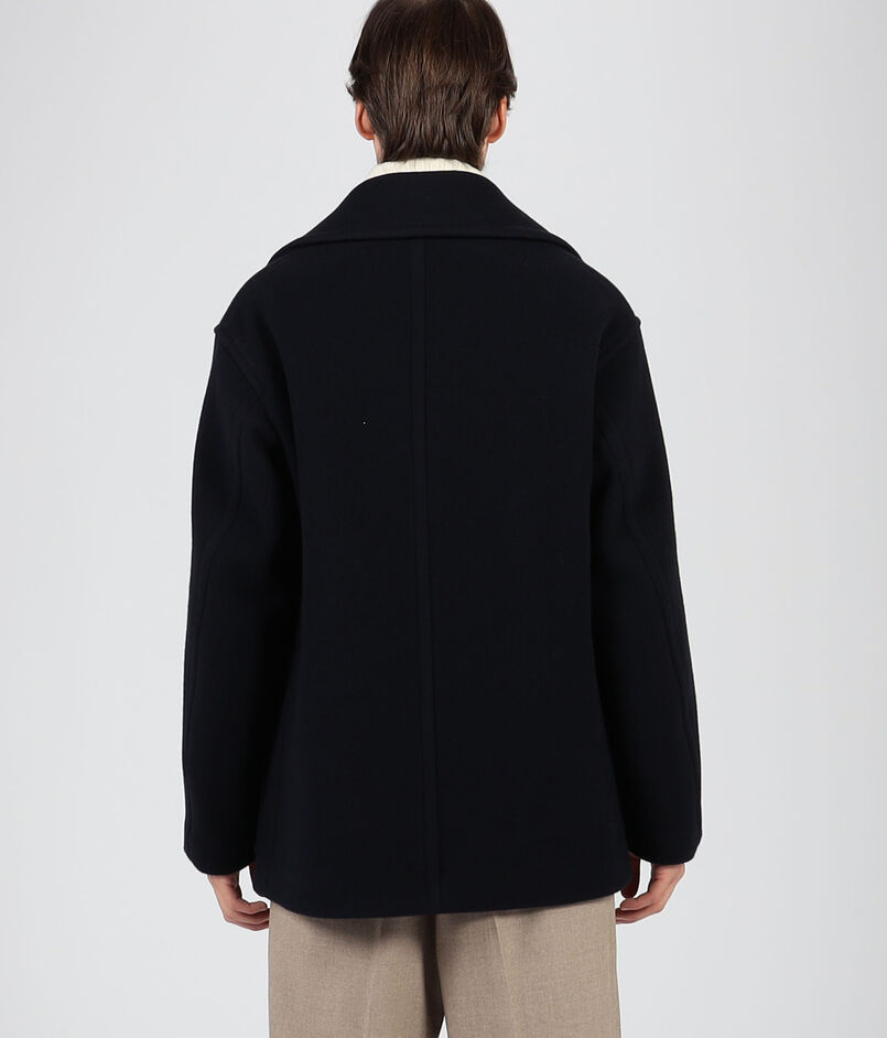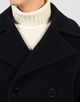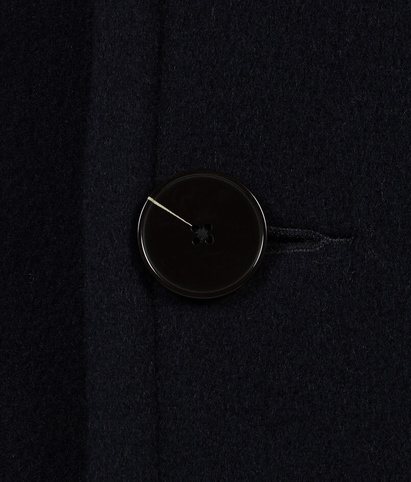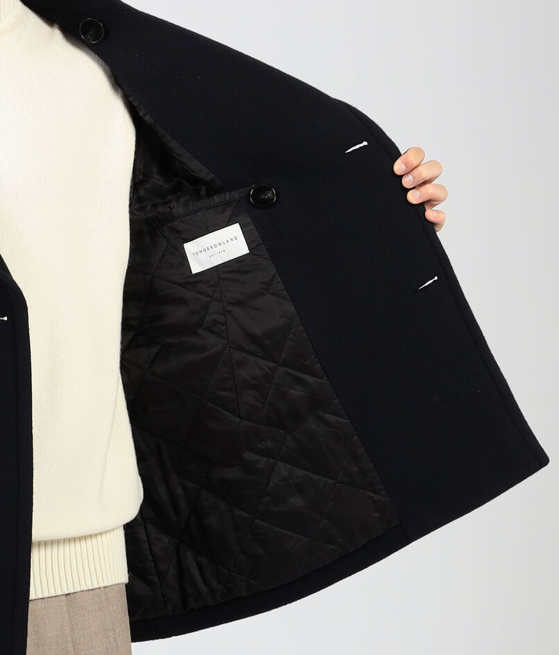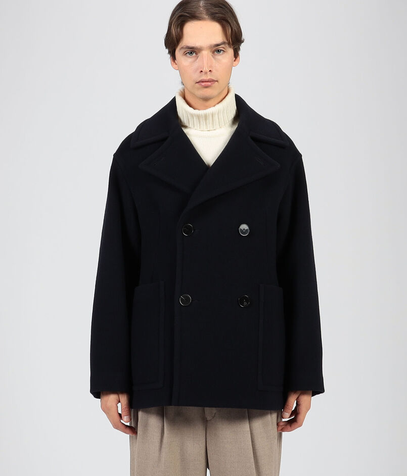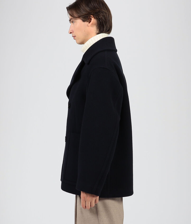 ラムウールを超細番手の「Super140’S」まで繊細に製糸したウール原料を二重織組織で織り上げたモッサー生地を使用したPコート。