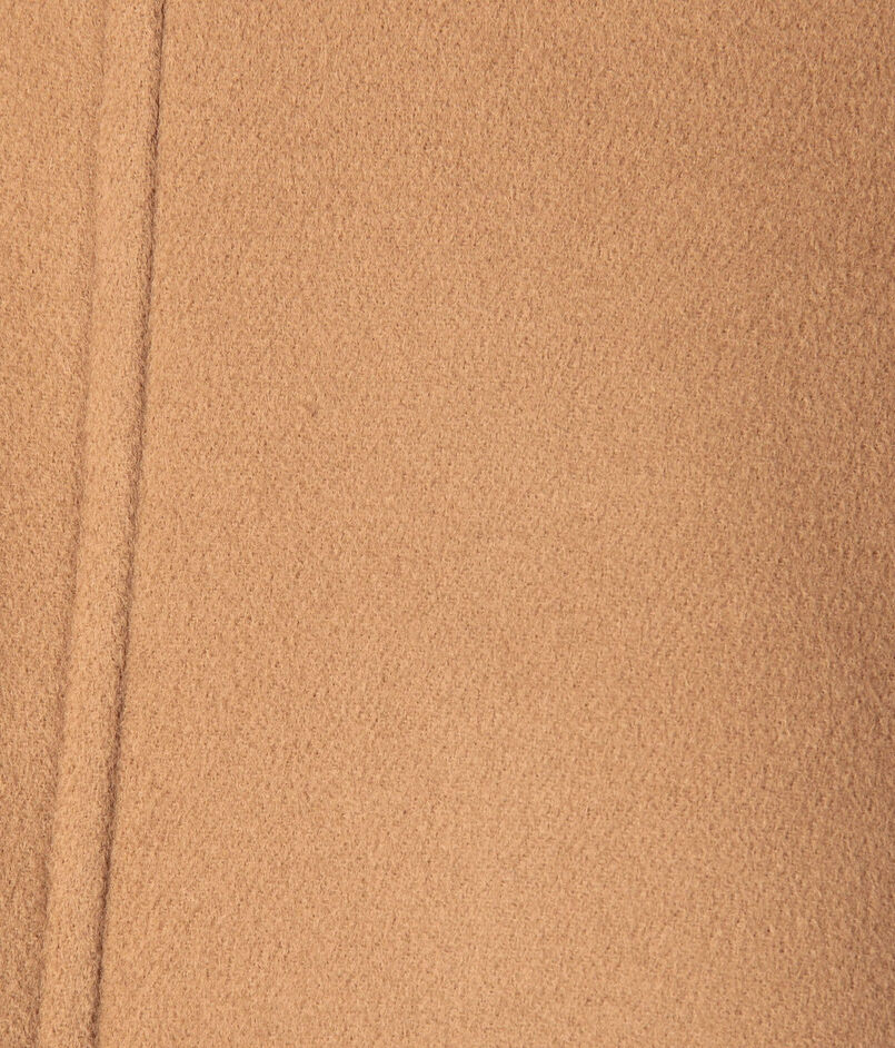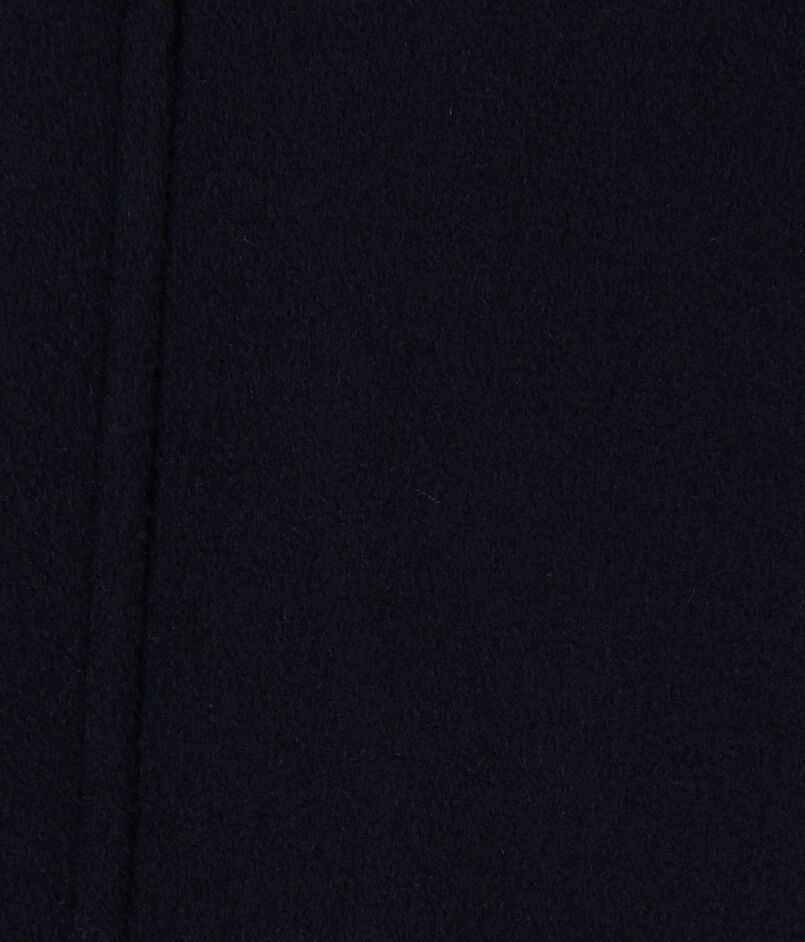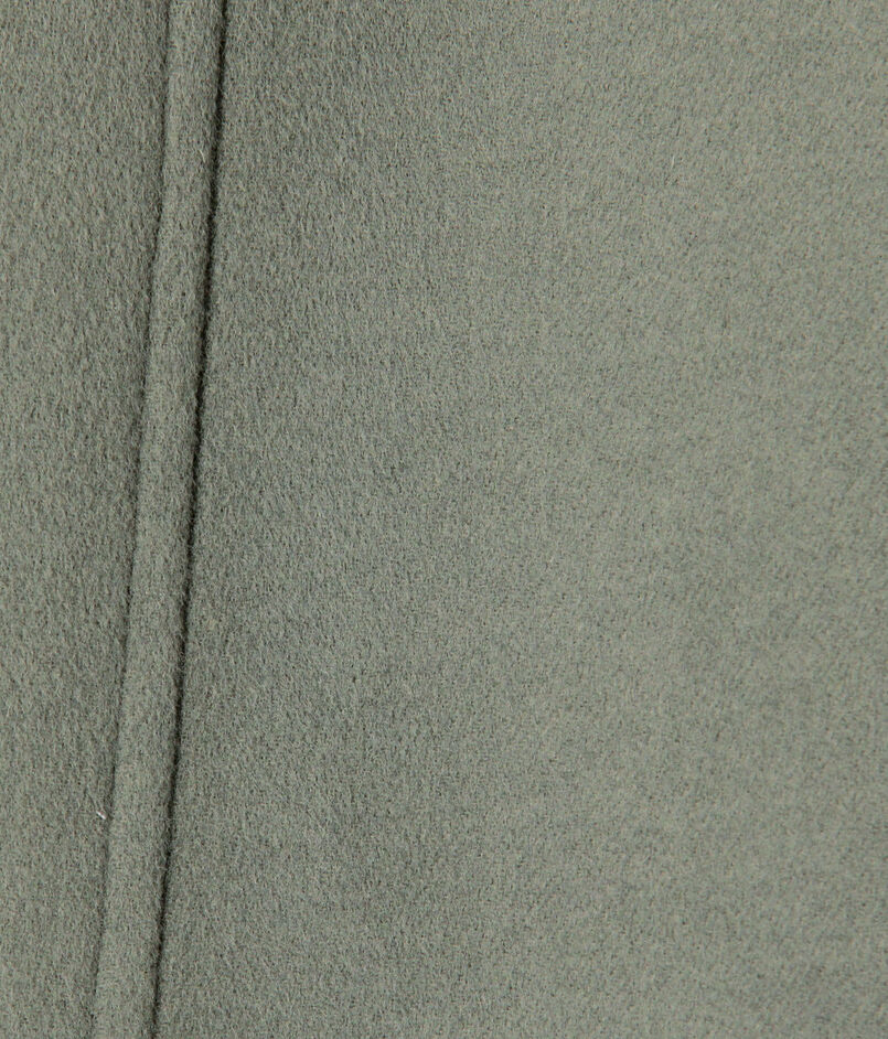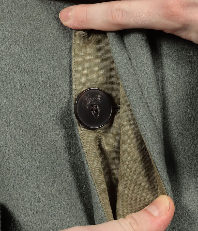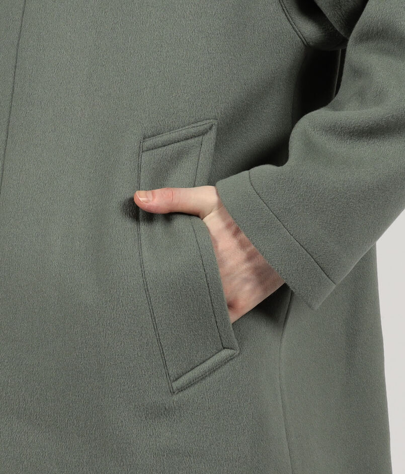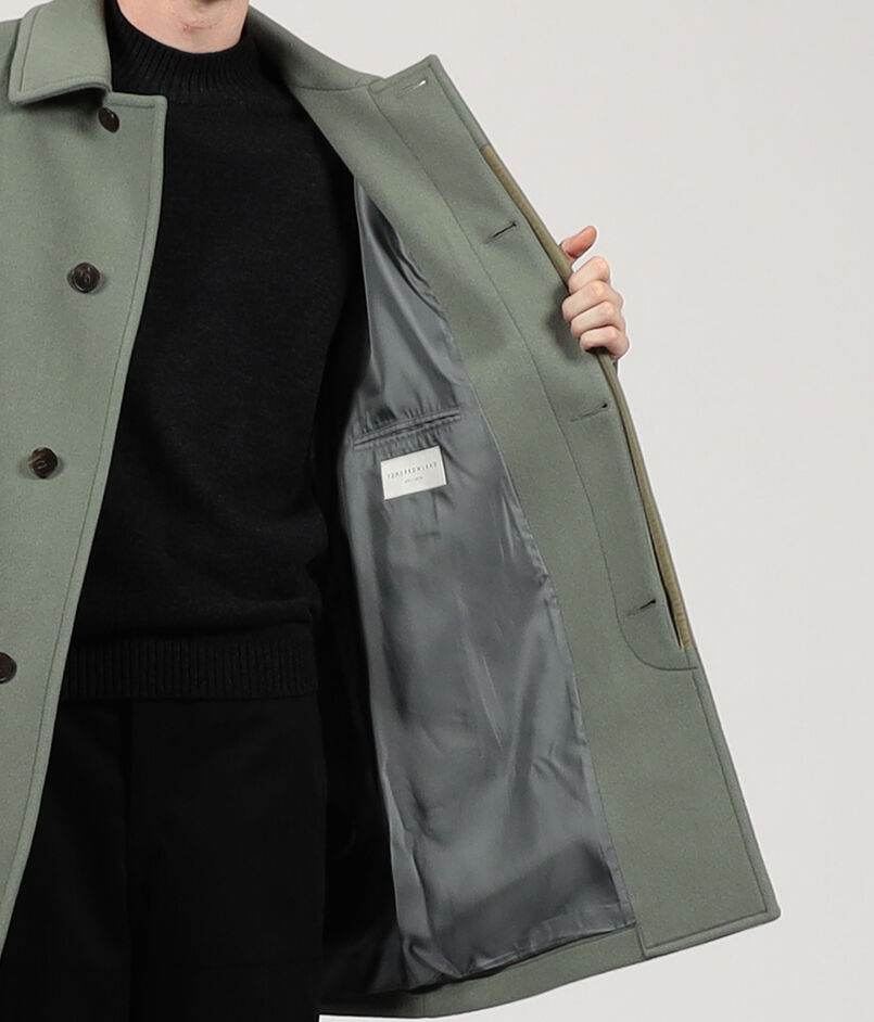 上質な「Super120”S」ウール原料によって織り上げたベルベット生地(パイル糸をカットして毛羽立たせた、上品な光沢と滑らかな肌触りが特徴の生地)を使用した柔らかさ、暖かさ、膨らみ、軽さを有する生地によって作成したミドルレングスバルカラーコート。