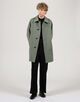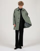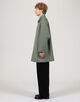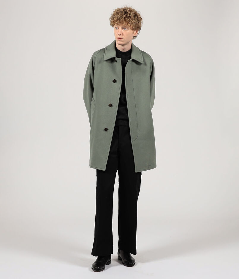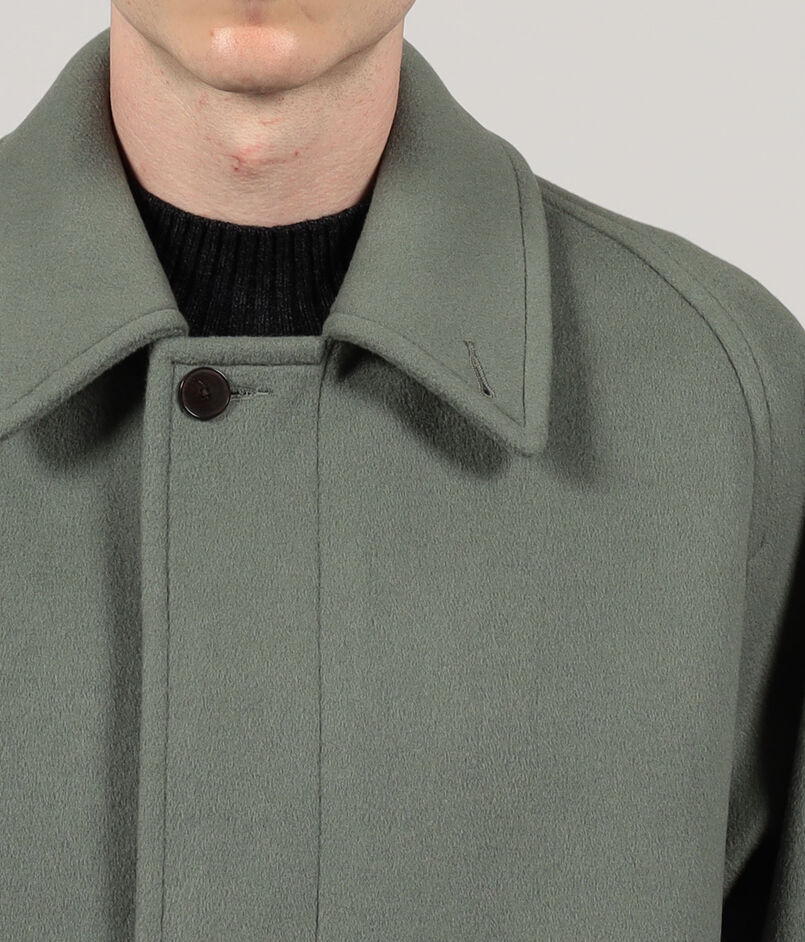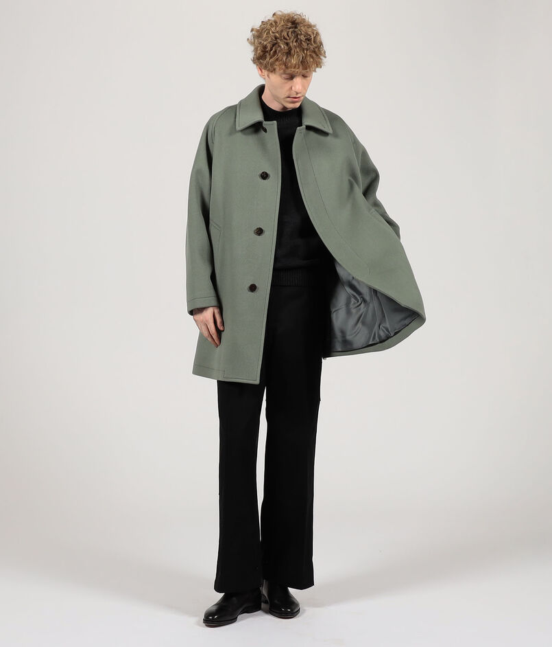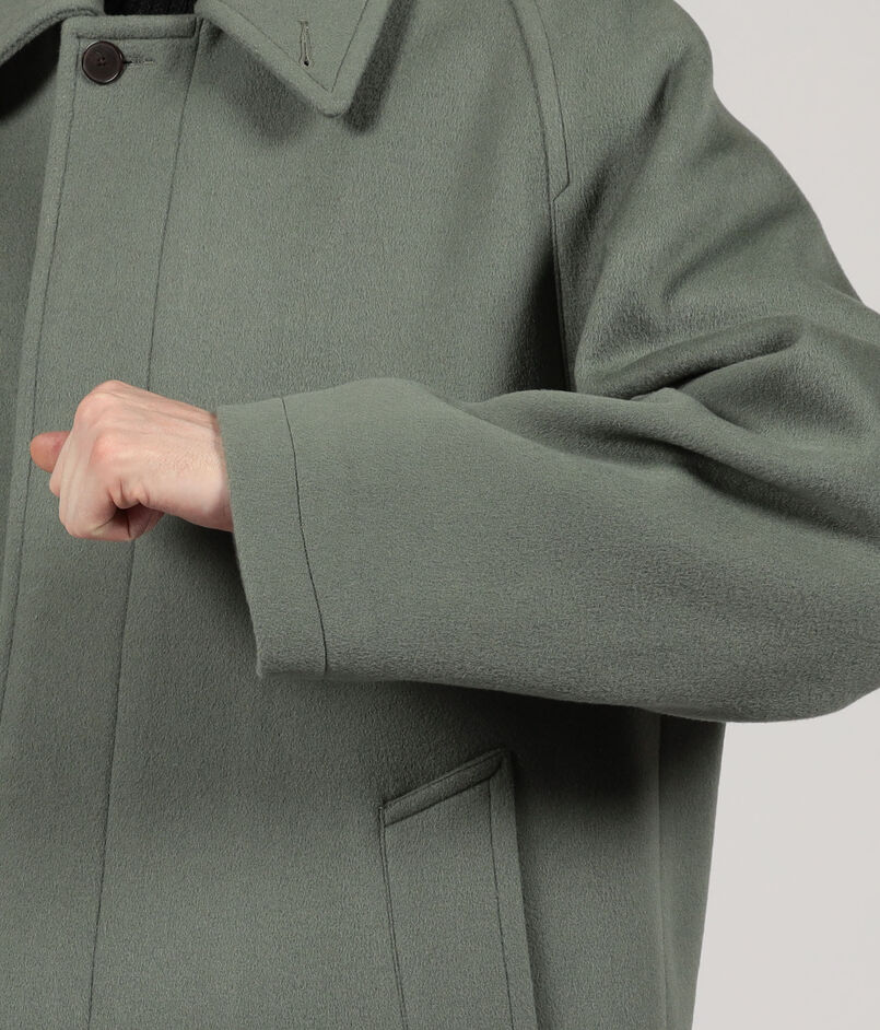 デザインはバルカラーコートらしいトラディショナルな意匠は踏襲したまま、1枚袖ながらの前振り袖パターン、特徴的なAラインシルエット、袖周りのリラックスしたボリューム感、大き目の腰ポケットなど、現代的なモダンアレンジを加えたデザインが特徴的なアイテムです。