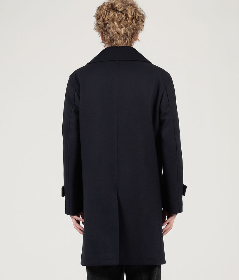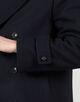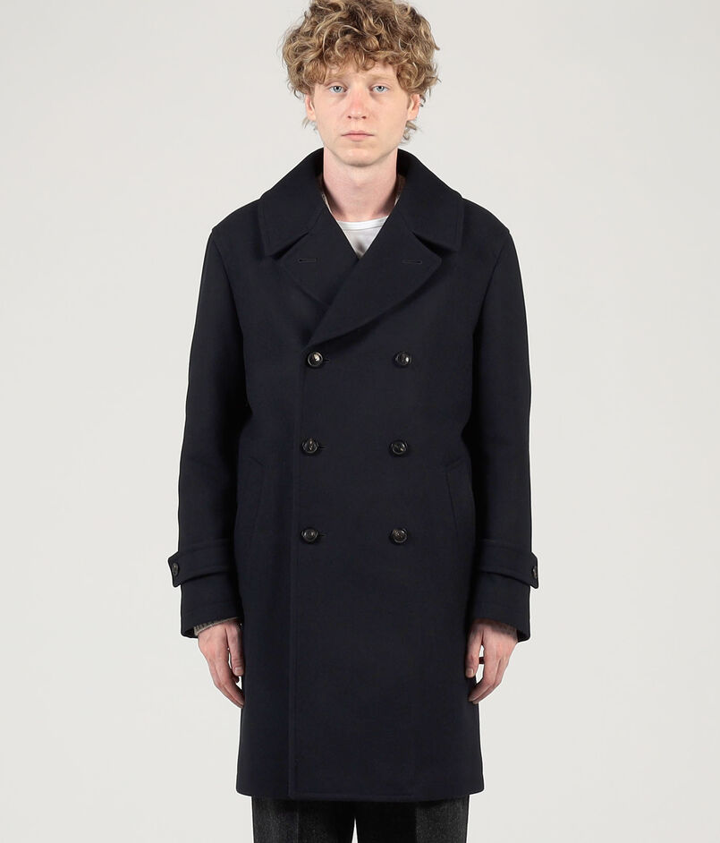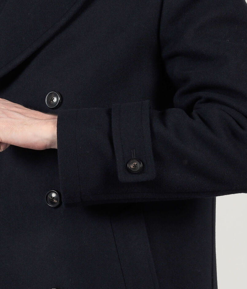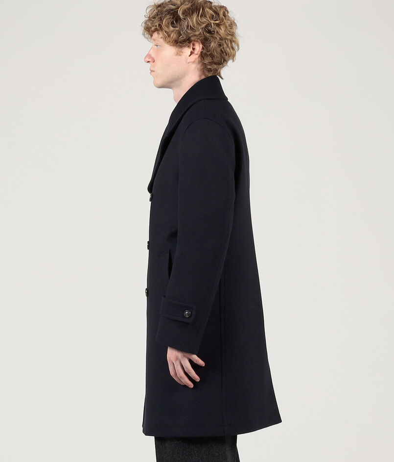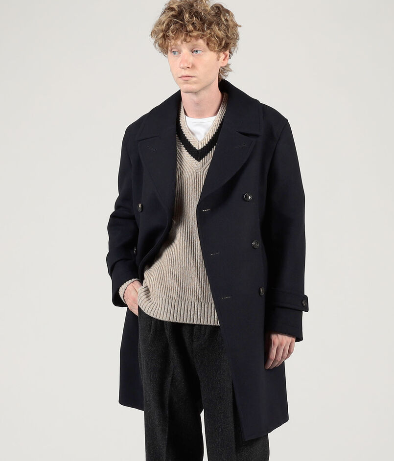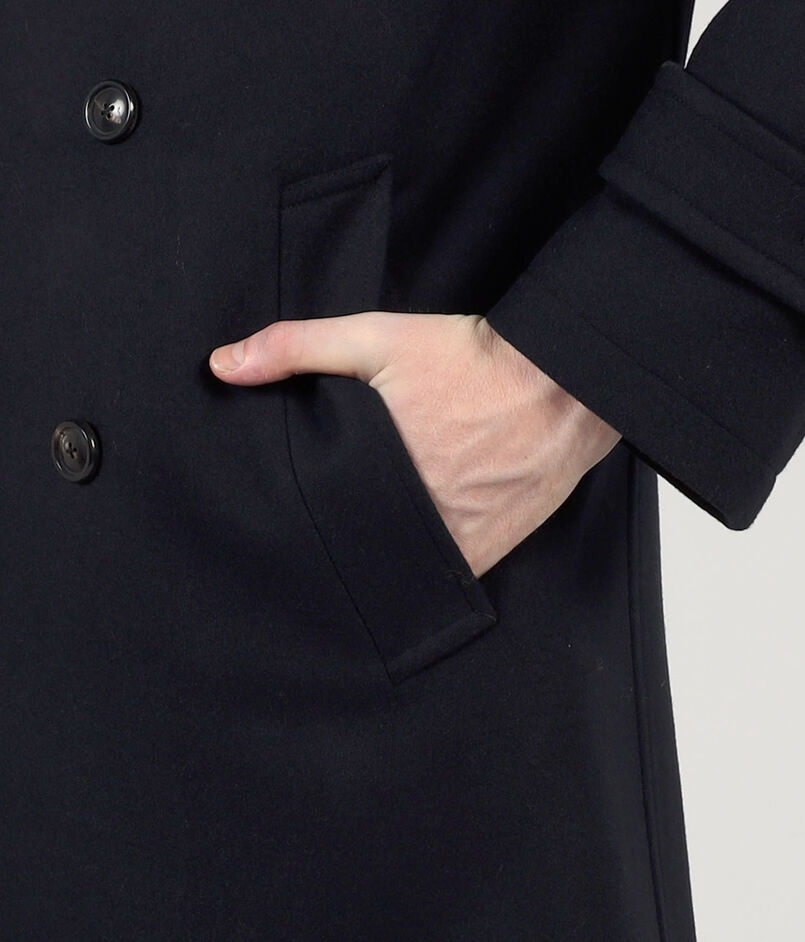 タスマニア原料を使用した620g目付のウール、カシミヤ混紡素材を使用したPコート。