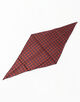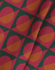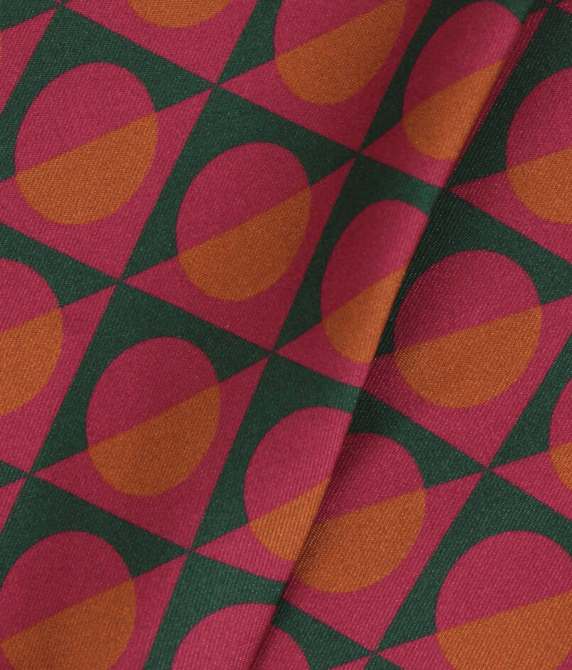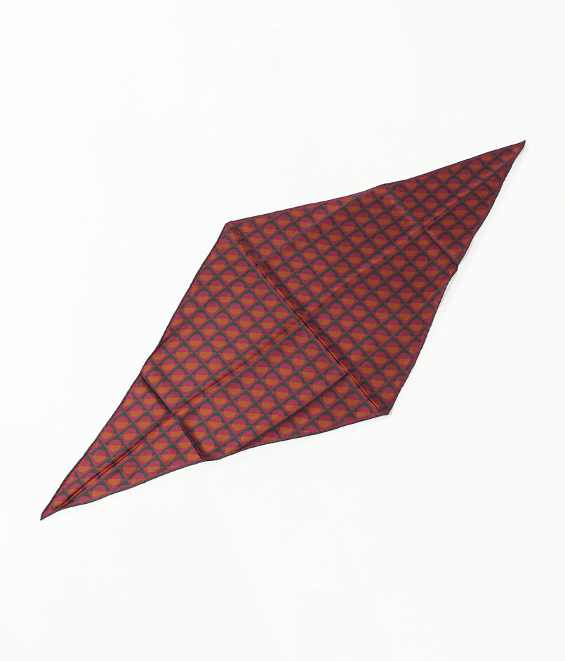 アクセントカラーの配色とジオメトリック柄が特徴のシルクスカーフ。