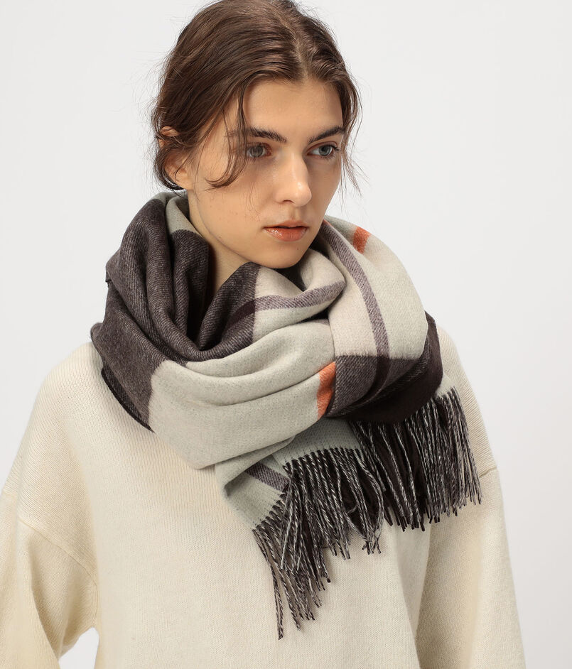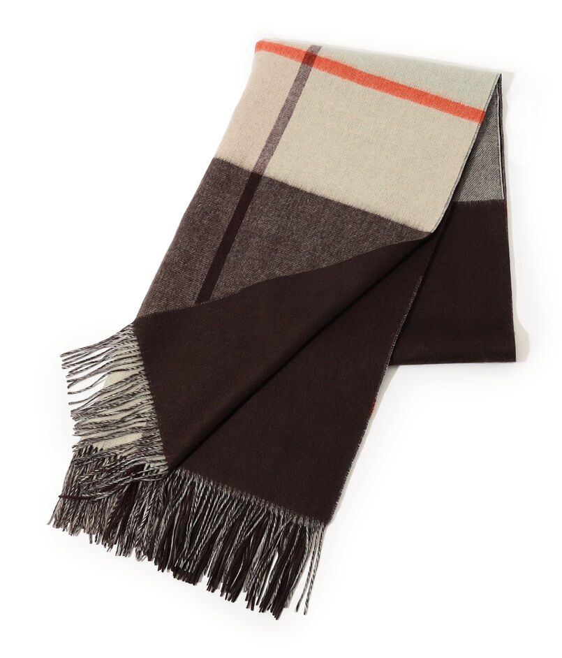 大きめのチェック柄に濃いブラウンと差し色のオレンジをあしらい、存在感のある表情に。