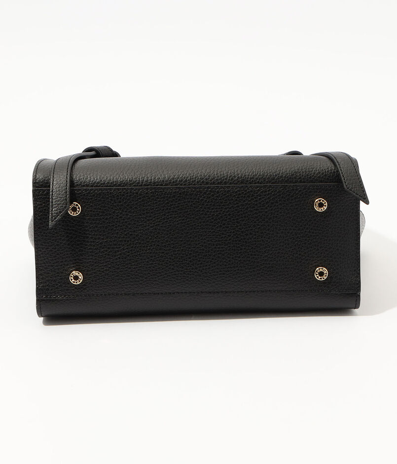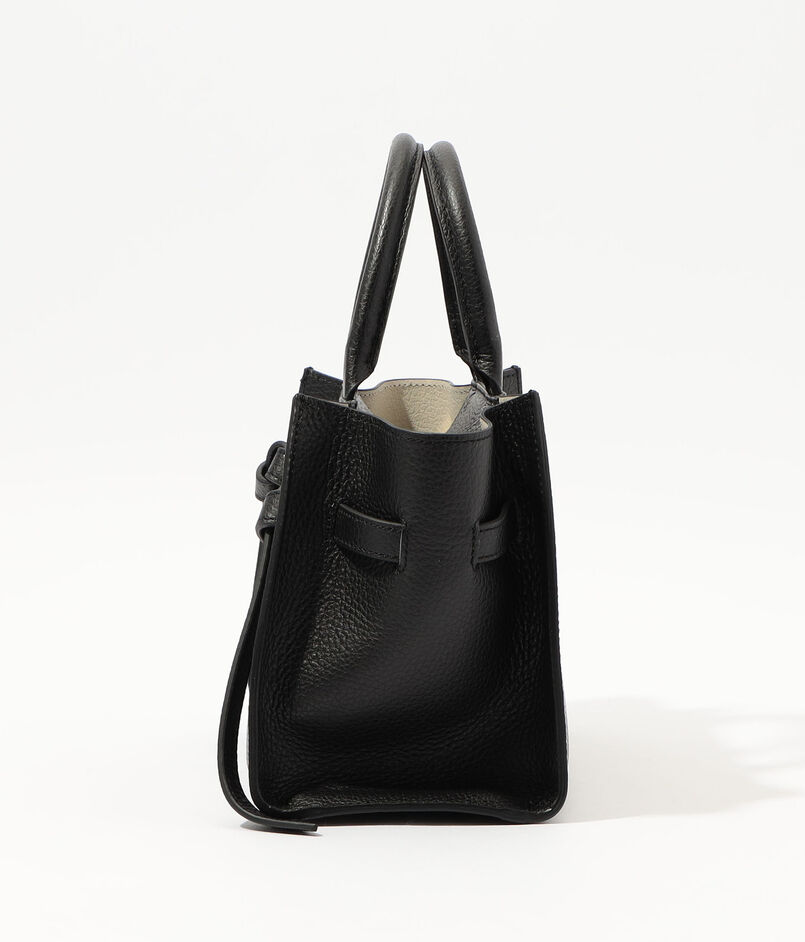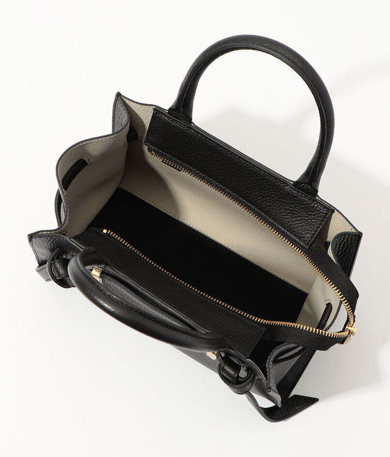 コンパクトなサイズ感ながら長財布が収まる収納力を備え、ベルトディテールがさりげないアクセントに。