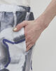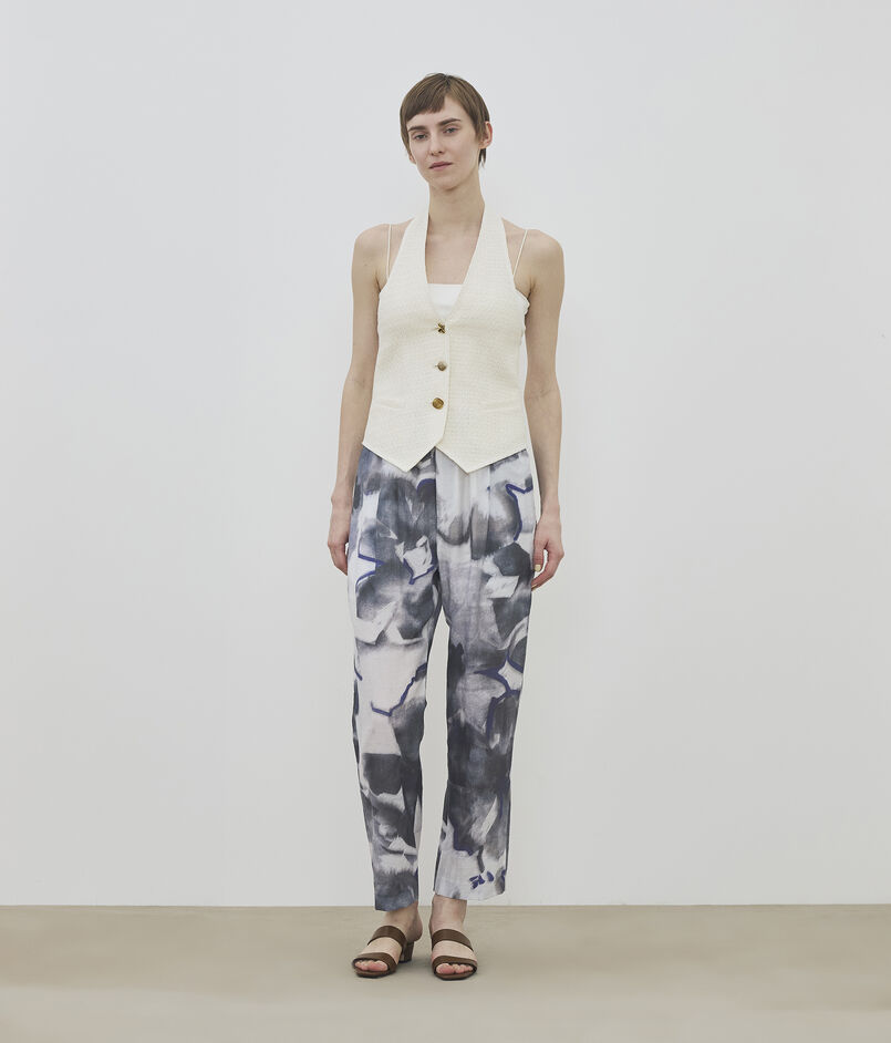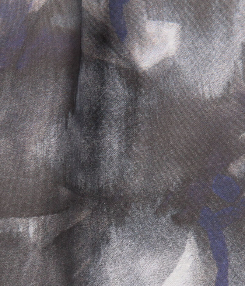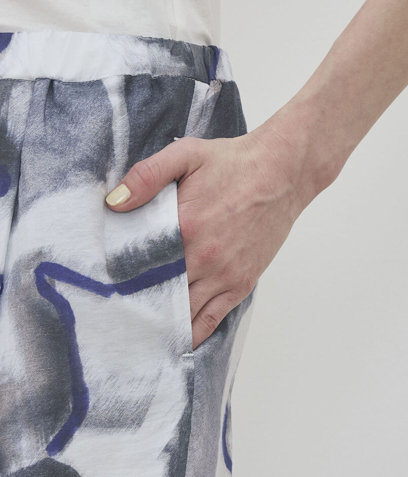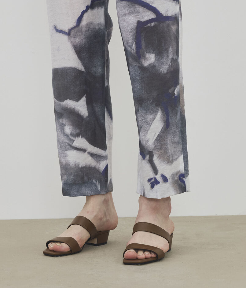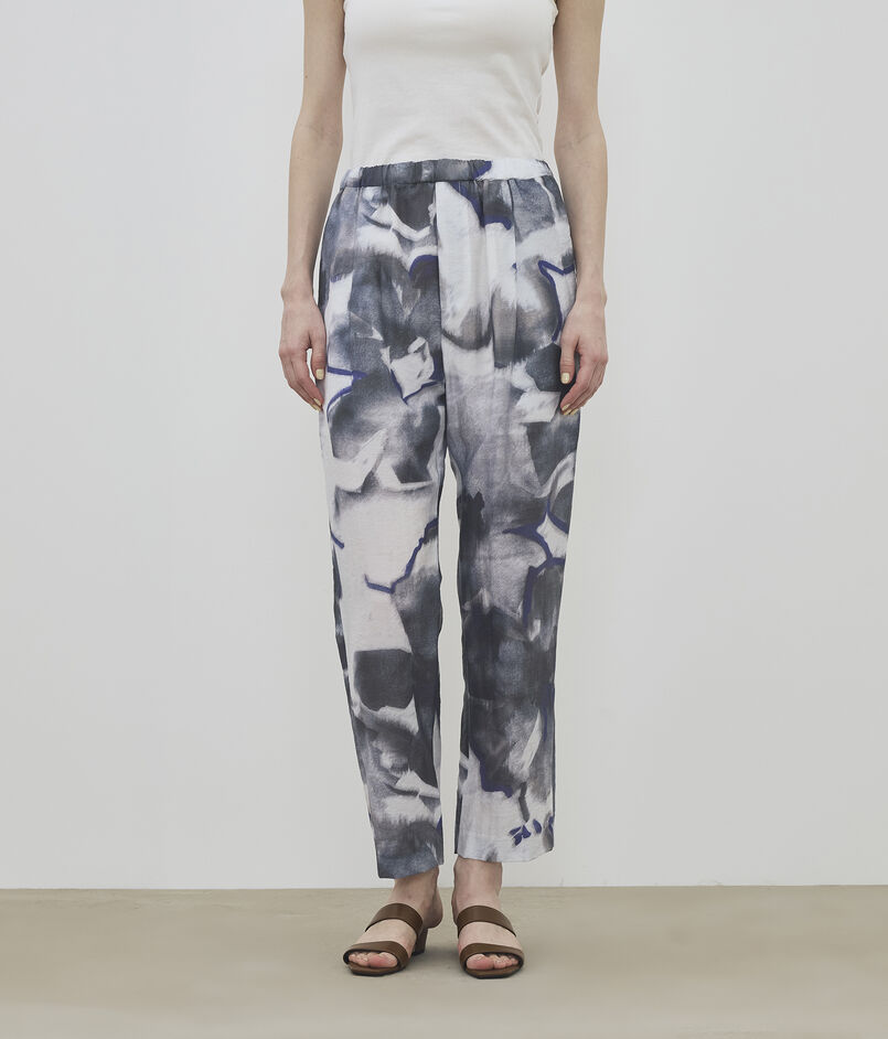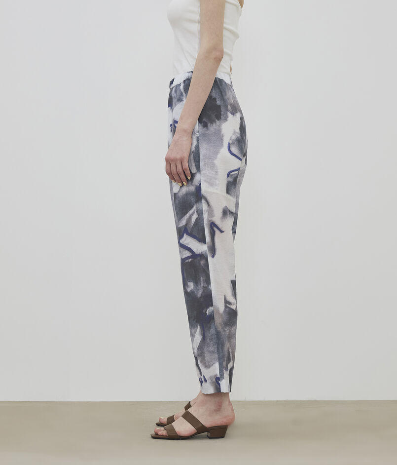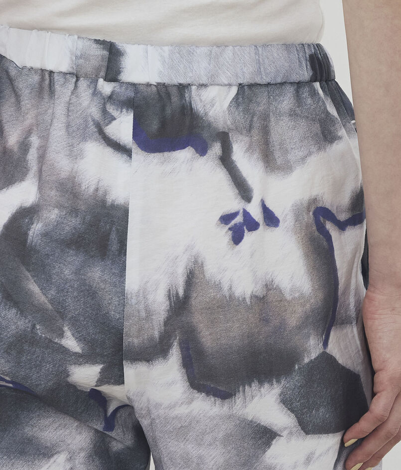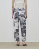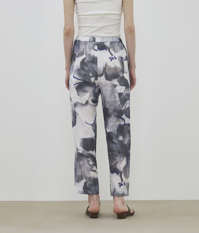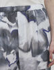 水彩画タッチのシックで洗練されたモノトーンプリントのタックパンツ。