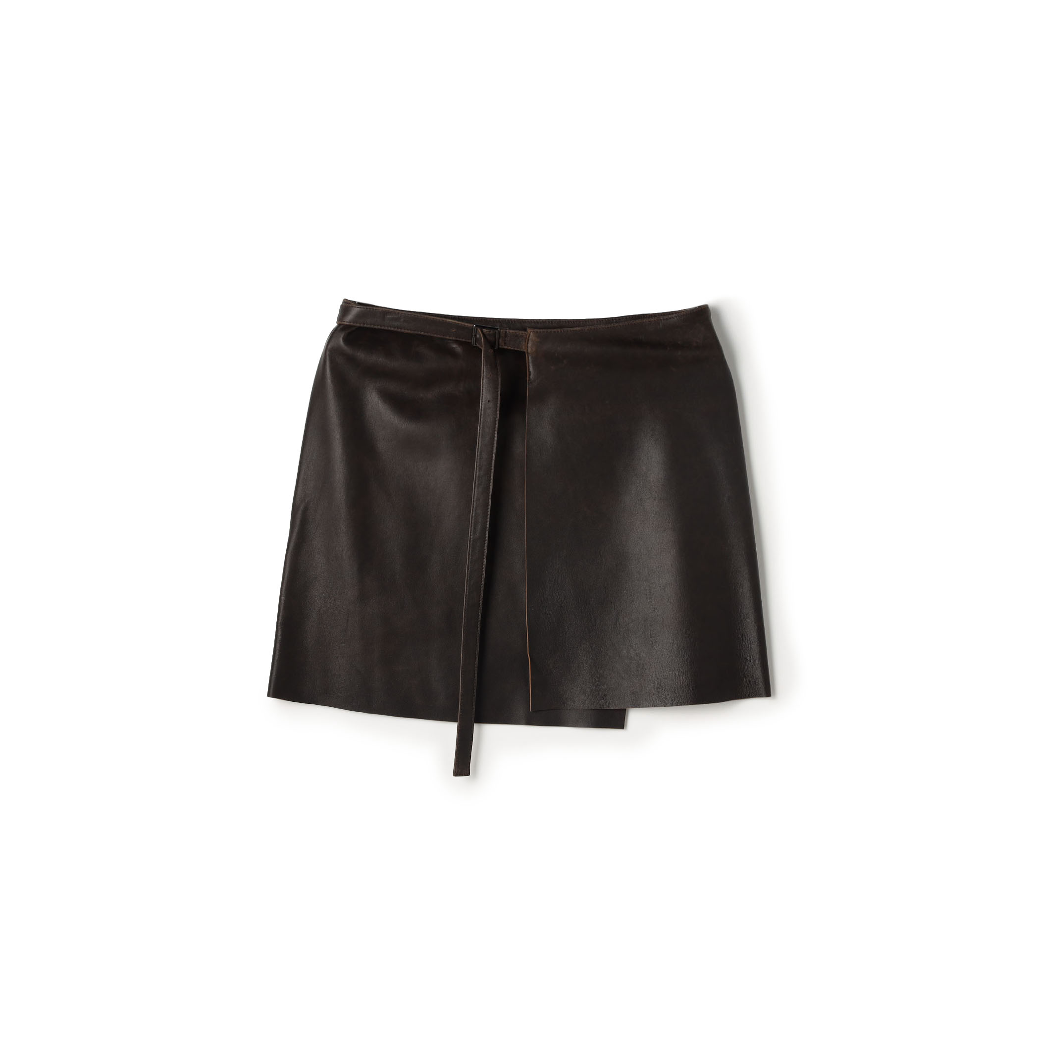柔らかいグリーンカラーのアイテムと秋らしいブラウンのレザーボトムスを合わせました。