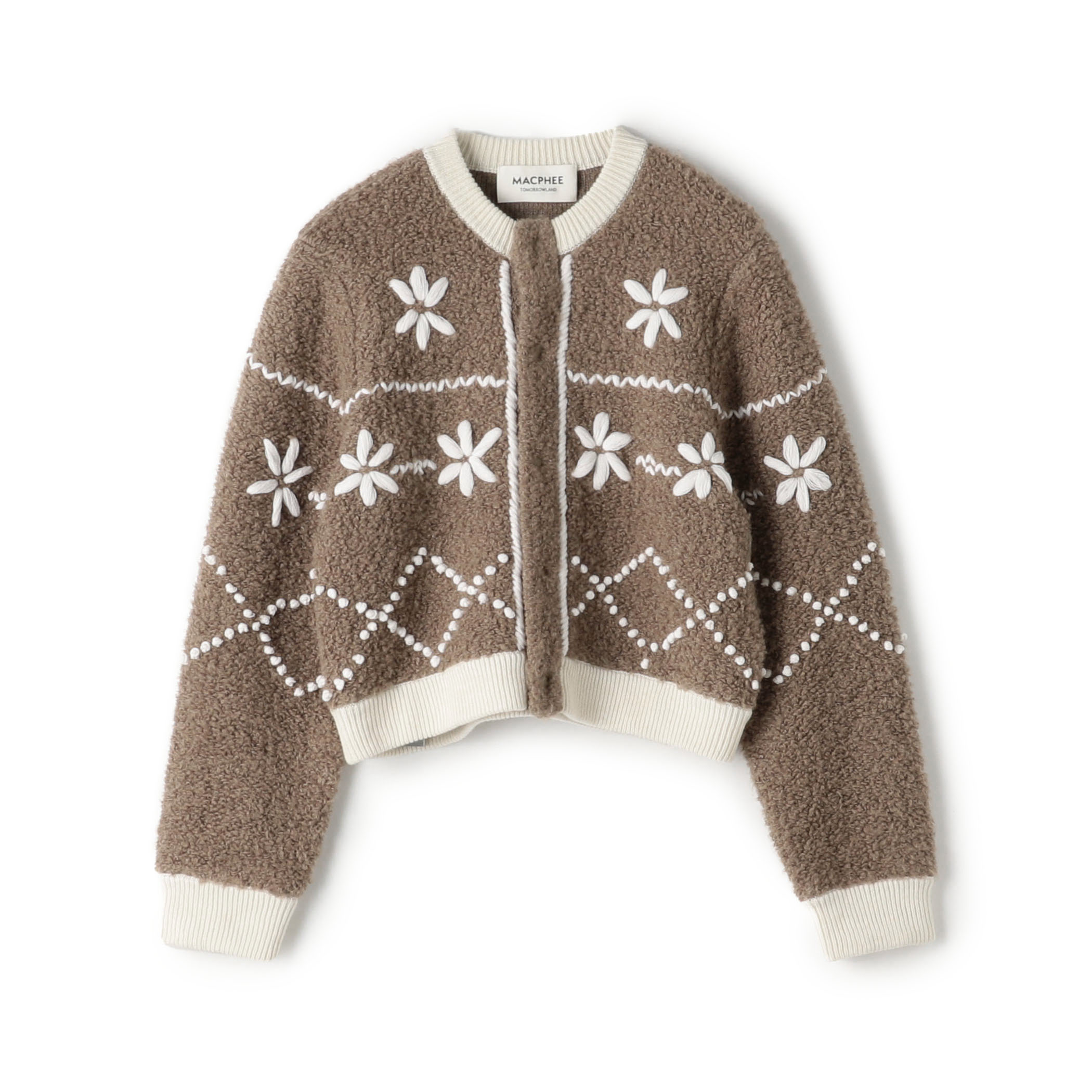 〈MACPHEE〉ムートンエンブロイダリー クルーネックカーディガンをデニムセットアップに羽織ったデイリースタイリング。オリジナルのハンド刺繍で秋冬感をたっぷりと感じられる1着です。カーディガンですが、ジャケットライクにお使いいただくのもおすすめ。
