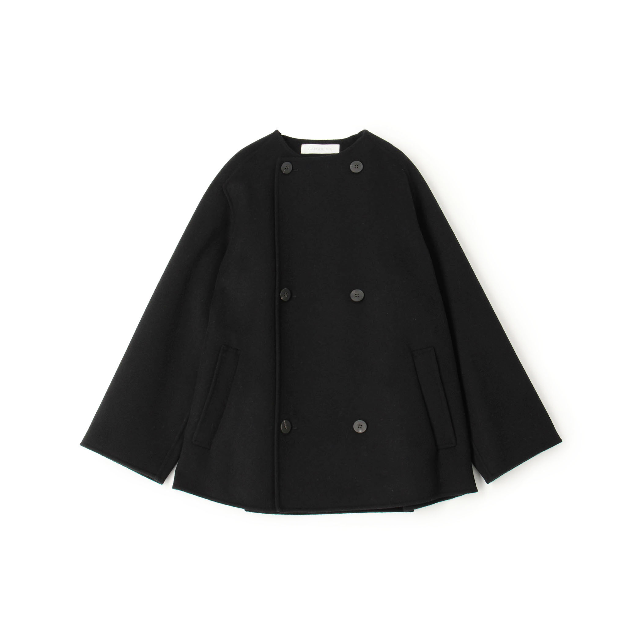 定番のダブルフェイスショートコートの新色ブラックを使ってブラックでまとめ、ニットはピンクを差し色にしました。