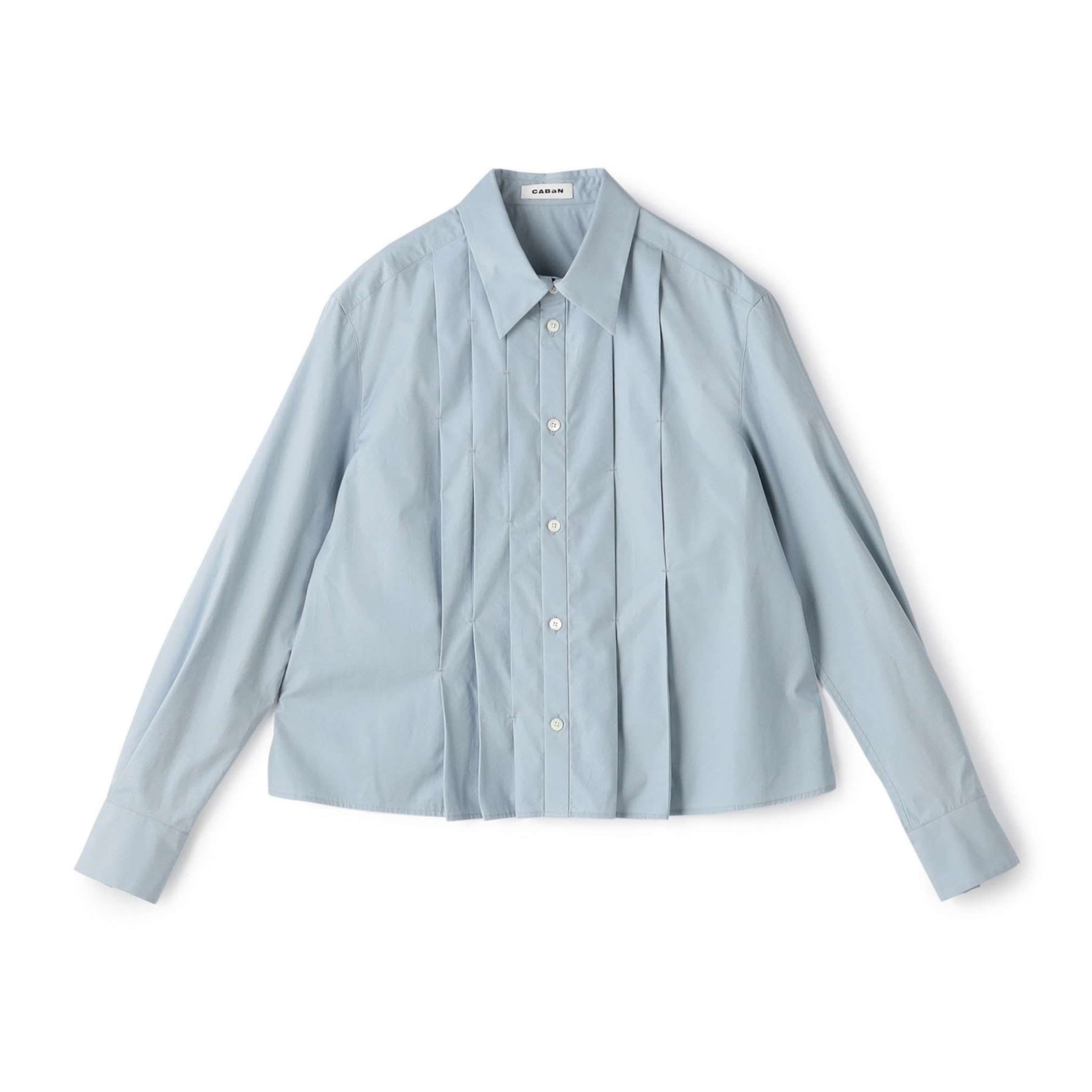 フロント部分にランダムな太めのタックを入れたデザインシャツブラウスです。