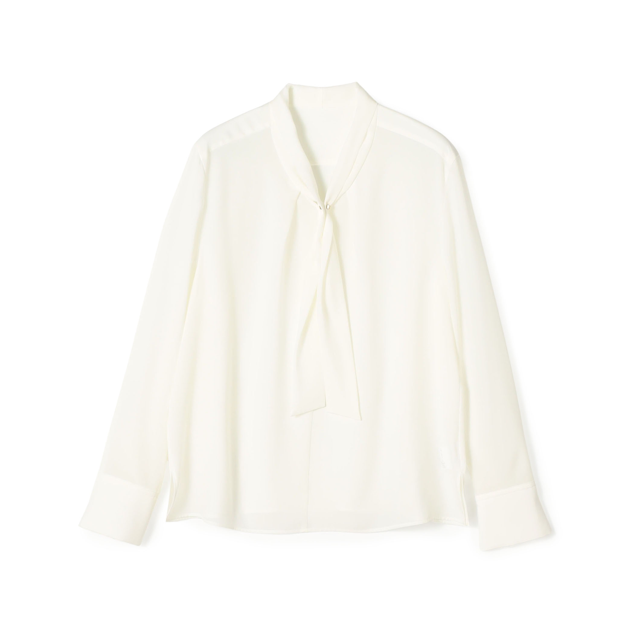 インナーは白のボウタイブラウスで顔まわりを明るく、マニッシュなダブルジャケットを肩にさらりと掛けて抜け感をプラスしました。
