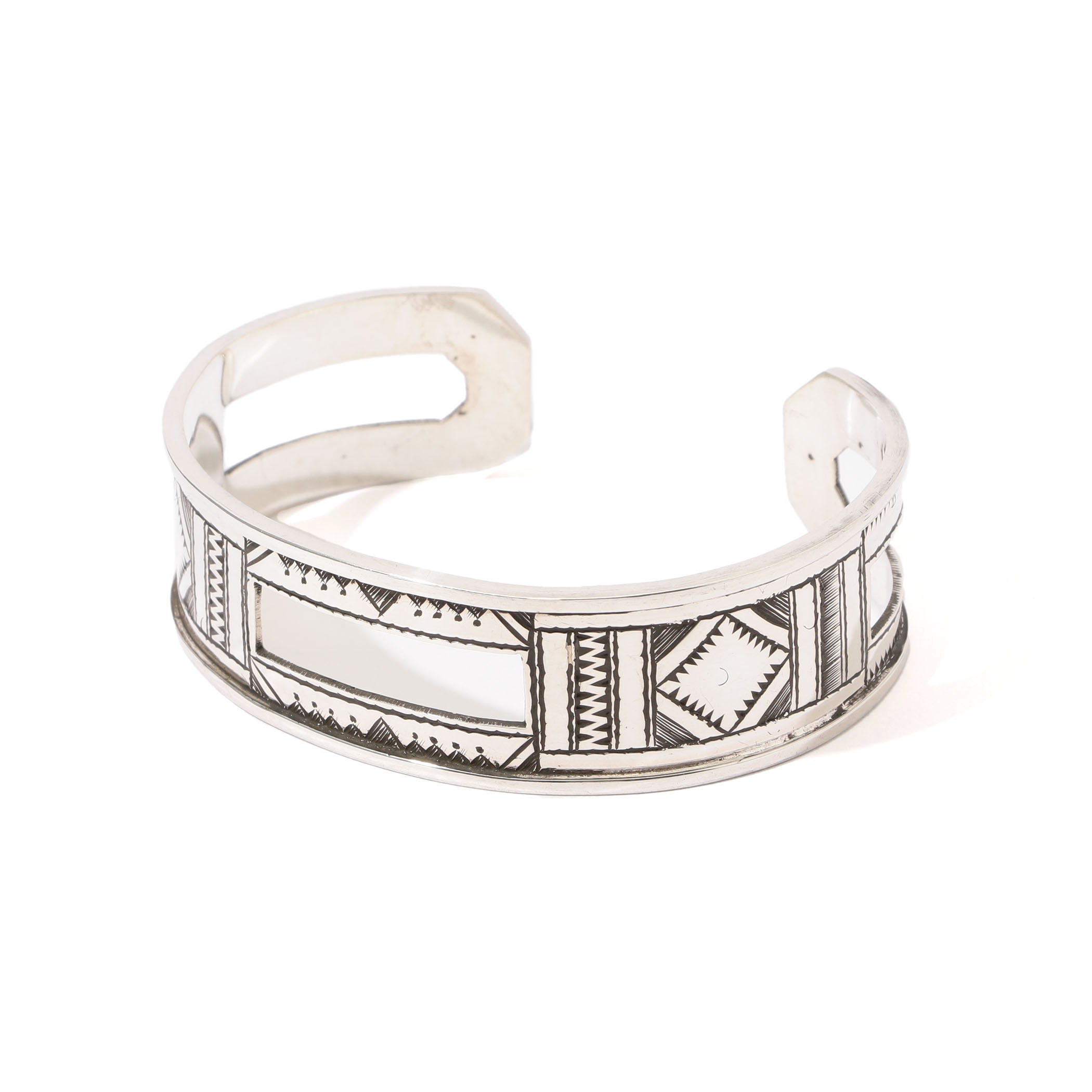 ピンストライプのクラシックなスラックス合わせ。トゥアレグの手彫り故やや歪んだ直線が持つ表情の豊かさをアクセントにしています。