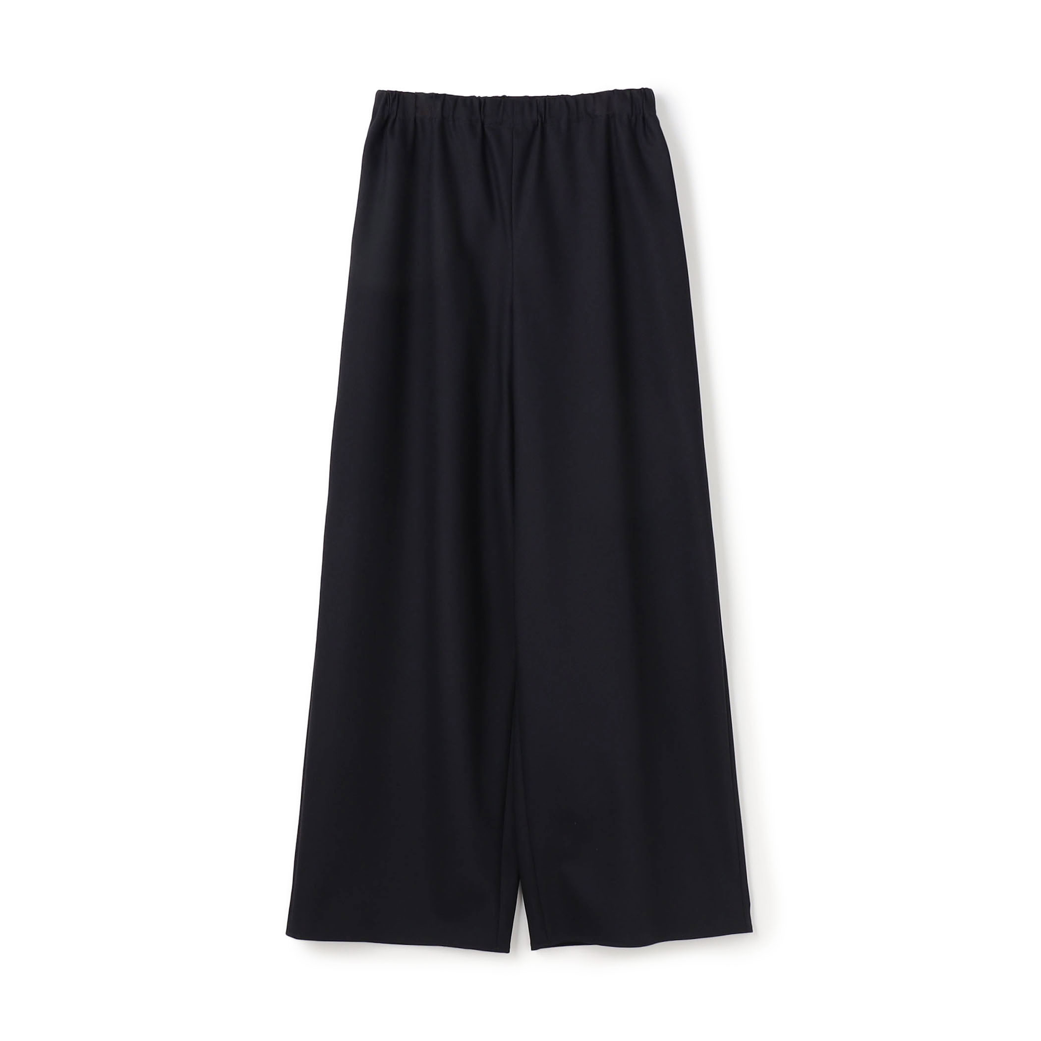 ギャザーを寄せた襟が特徴のブラウスを使ったネイビーのワントーンスタイル。