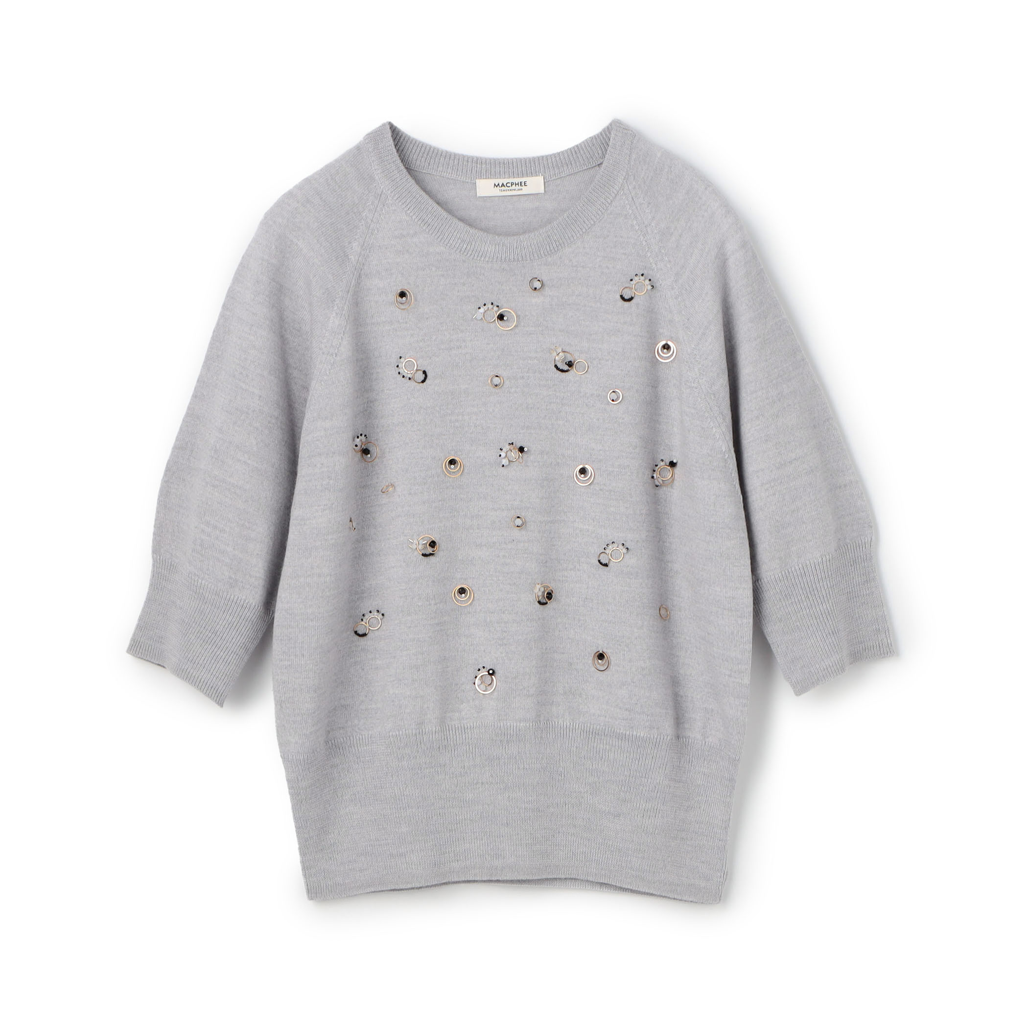 ガラスビーズやリングパーツなどを組み合わせたビジュー刺繍が華やかな〈MACPHEE〉のニットです。