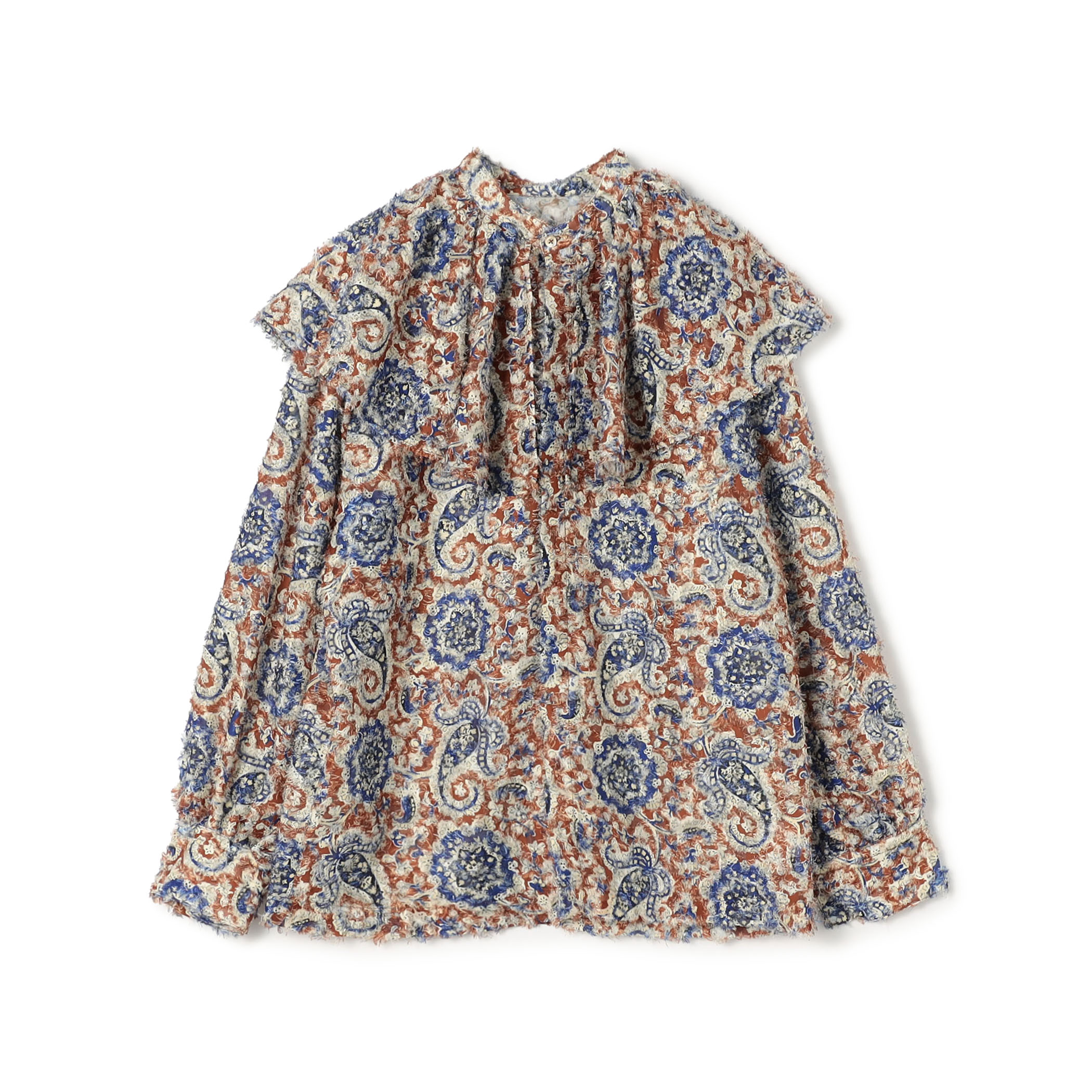 カジュアルになりすぎないようにシルエットが綺麗なもの、素材で楽しむアイテムを合わせてブラウスのジャガード素材を際立てています。
