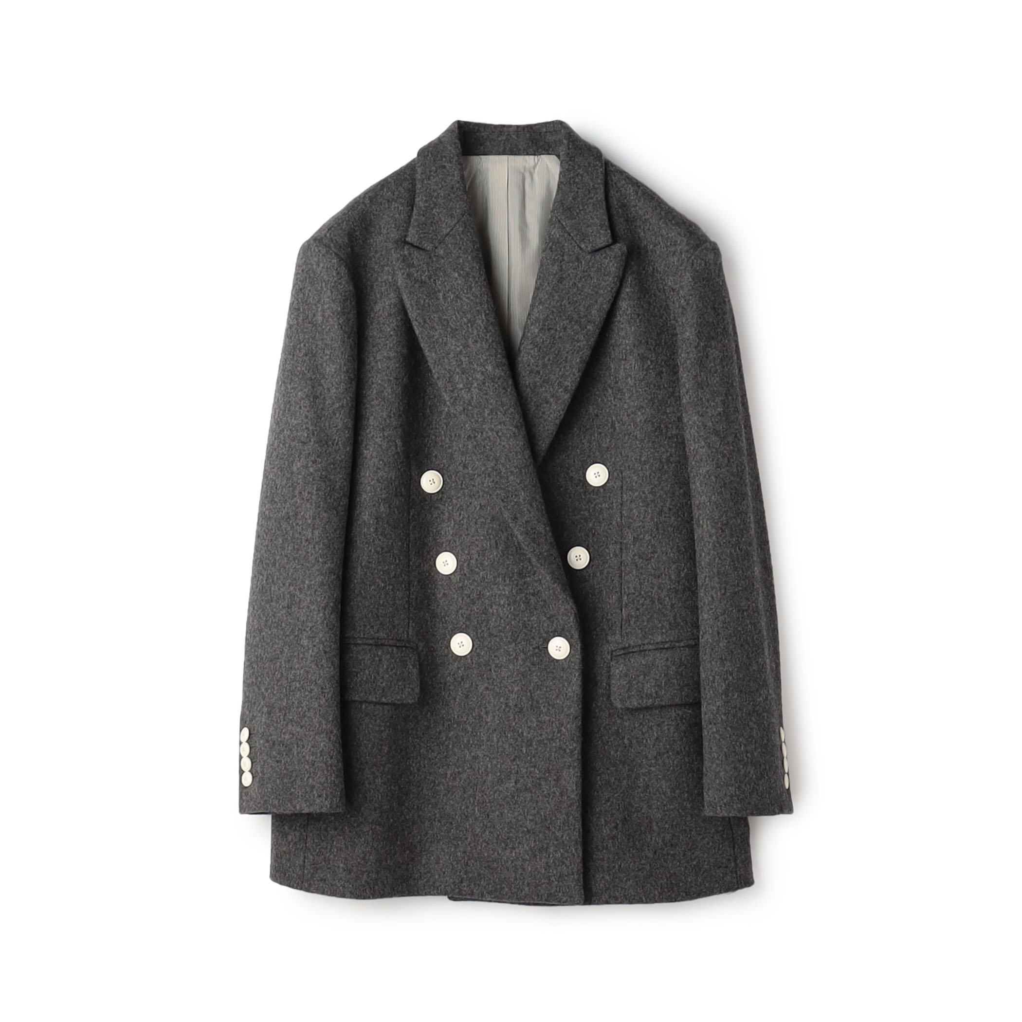 ウールメルトンのショートコートは、クラシカルなシルエットとピークドラペルがシャープな印象に。