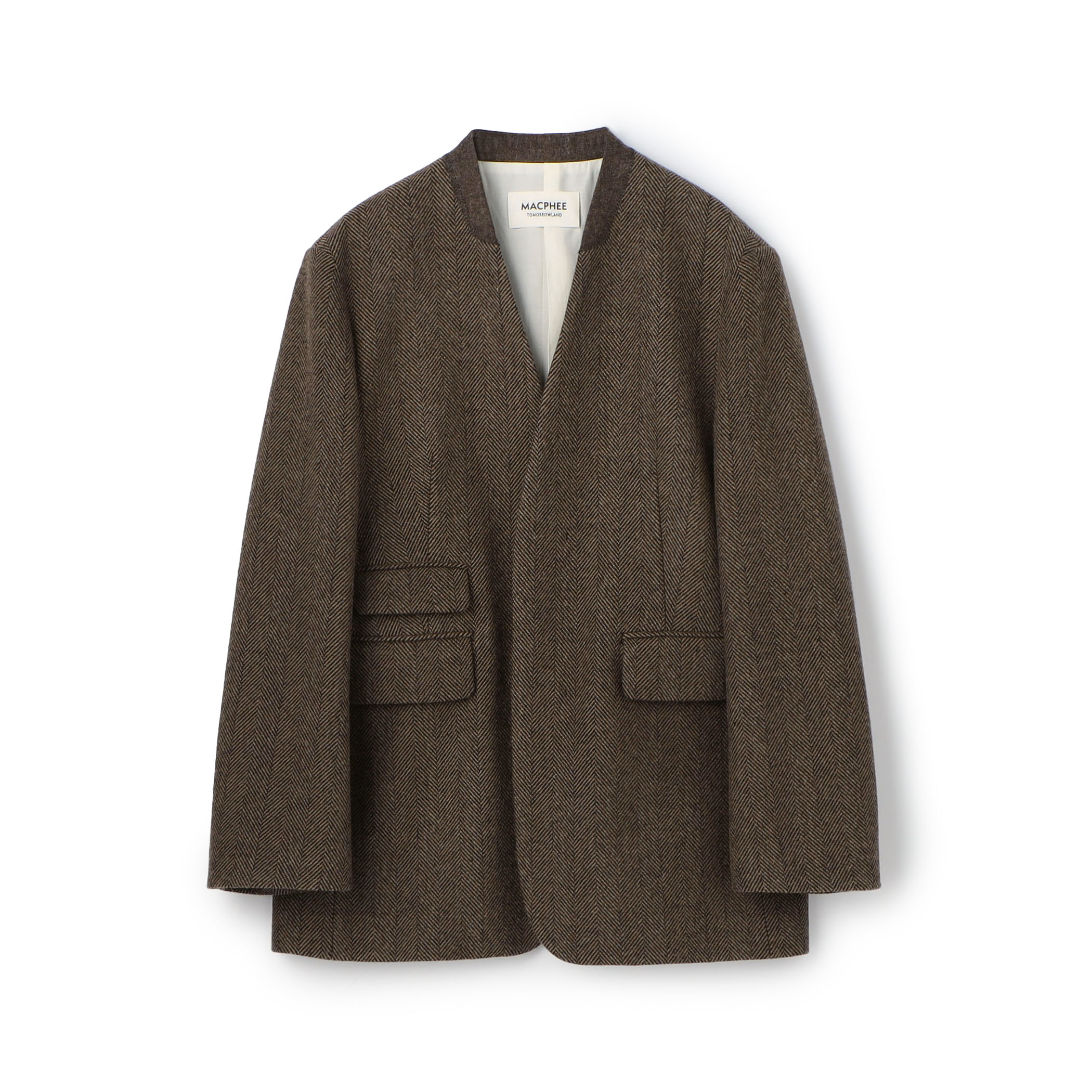 ブラウンのノーカラージャケットはメンズらしくなりやすいので、インナーやジュエリーのセレクトがポイントです。