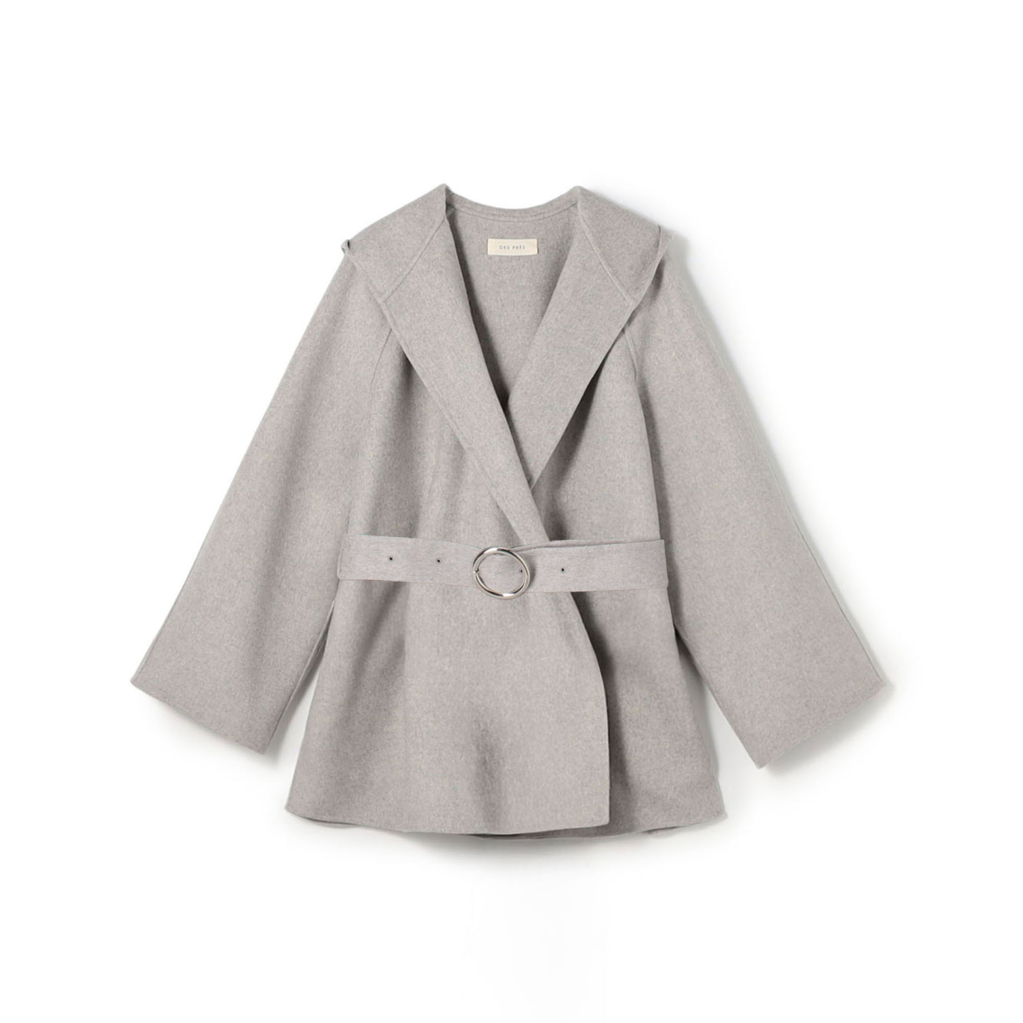 フーテッドショートコートは、ウエストマークをするとバランスもとりやすく、スカートスタイルが多い方にもおすすめです。