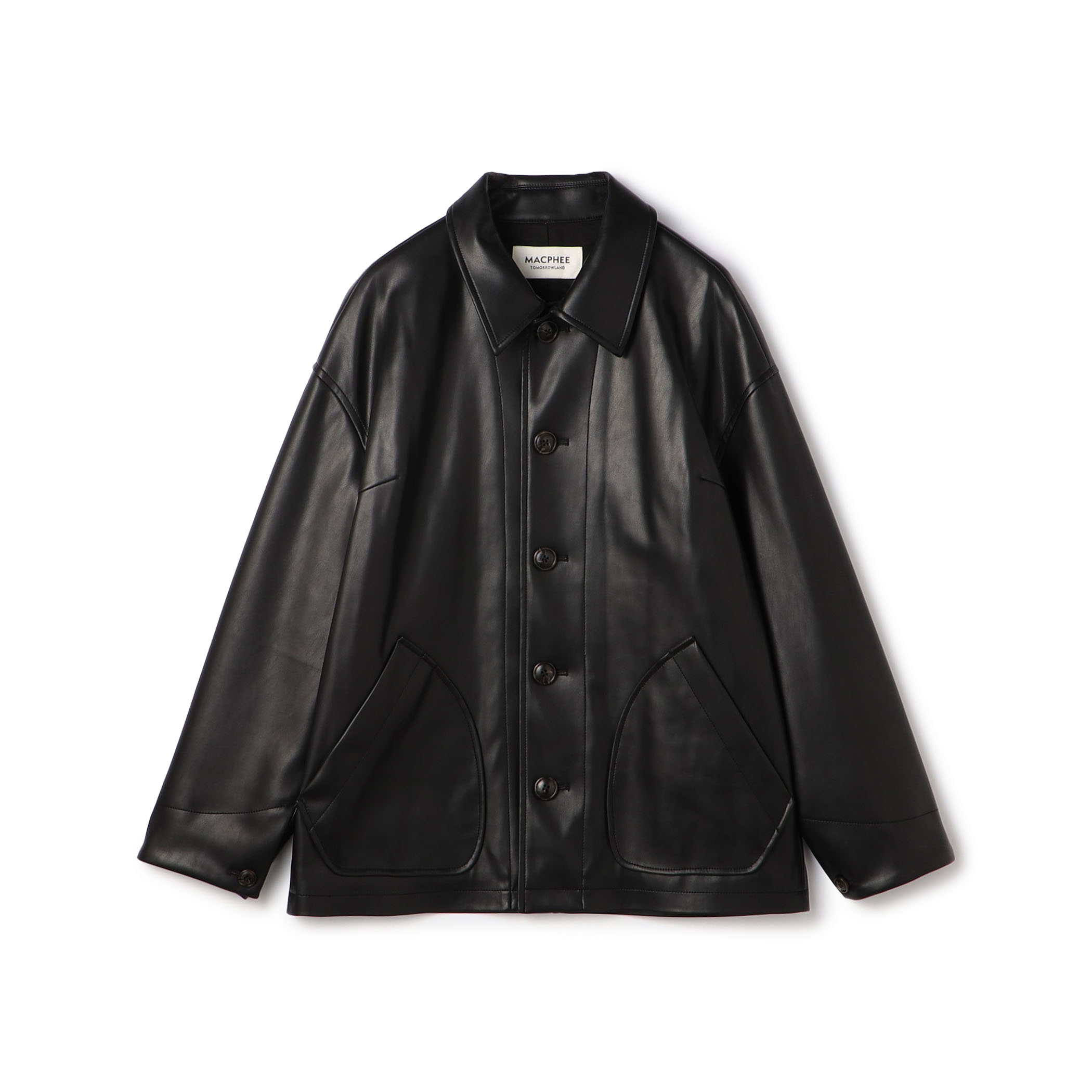 〈GALERIE VIE〉 コットンフリルシャツは、洗いざらしのようなナチュラルなシワ感がオシャレな1枚。辛口なレザージャケットから袖を出して甘さをプラスしたベーシックなコーディネートで着用しました。